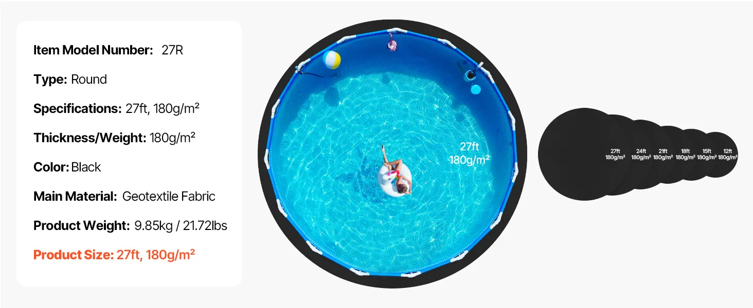 VEVOR 27ft Round Pool Liner Pad, Pool Liner Pad for Above Ground Swimming Pools, Extra-Thick Pool Mat, Prevents Punctures, Recycled Geotextile Material Underlayment Pad, Extend Liner Life