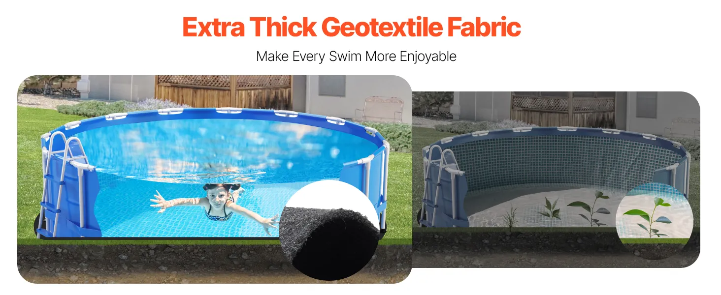 Extra-thick for Comfortable Experience: Made from extra-thick and high-strength non-woven geotextile, this pool mat for above gound swimming pool provides excellent cushioning, making walking comfortable. The extra-thick design blocks weeds and keeps the water clean, eliminating the hassle of cleaning.