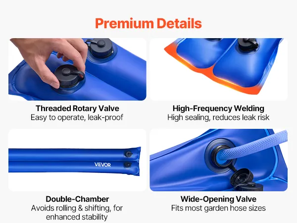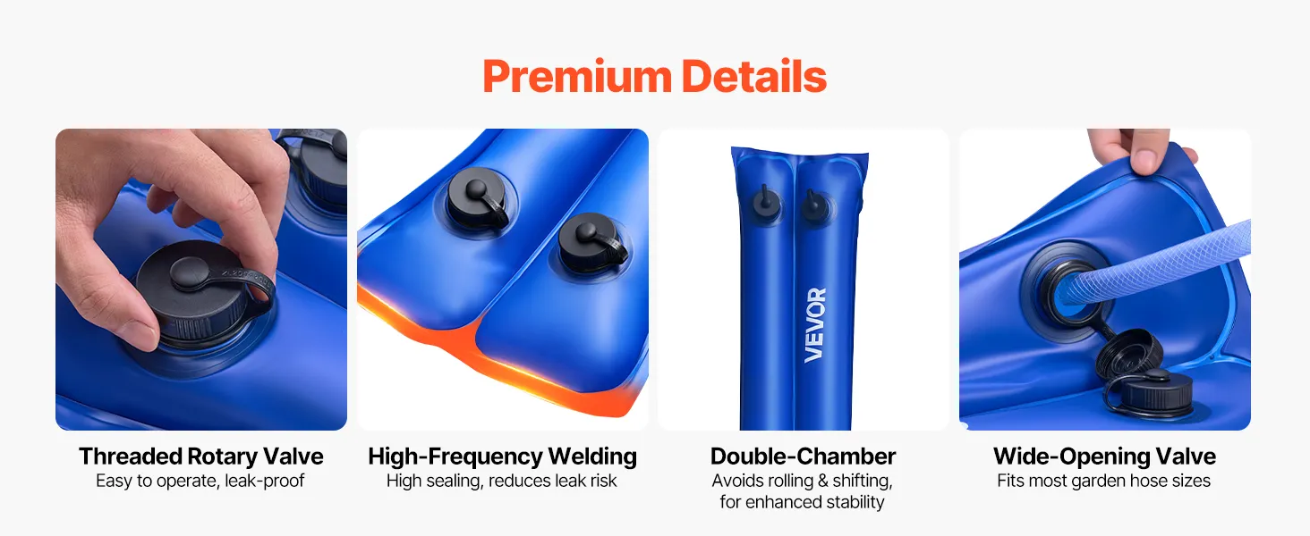 Includes an integrated threaded twist valve for smooth, leak-proof operation. The widened opening fits most garden hoses for easy filling, while 0.59-inch heat-welded seams offer secure sealing and minimize leakage. Dual chambers prevent rolling in strong winds, improving stability.