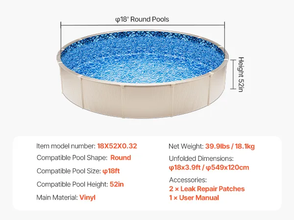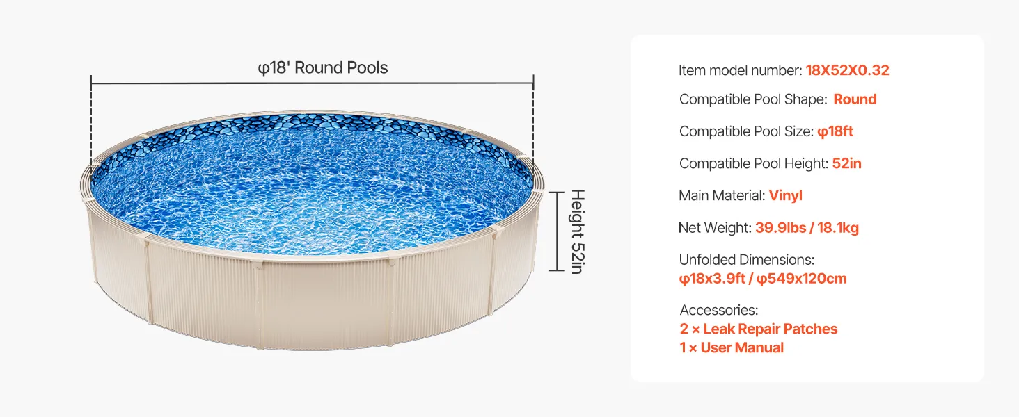 Fit for 18ft Pools: Our pool liner is specially measured to fit 18-ft round pools with a flat bottom and wall height of up to 52 inches, ensuring an exact and secure fit for your pool.