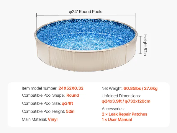 Fit for 24ft Pools: Our pool liner is specially measured to fit 24-ft round pools with a flat bottom and wall height of up to 52 inches, ensuring an exact and secure fit for your pool.