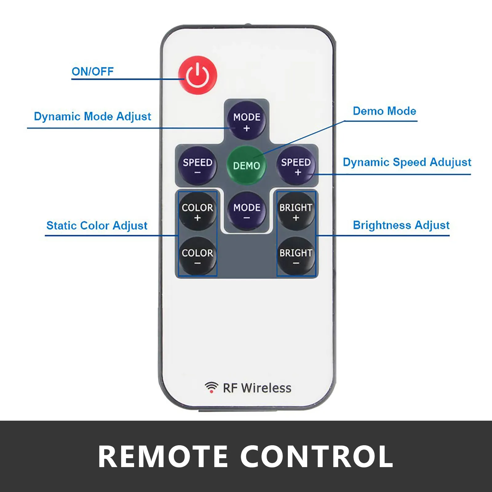 18 different colors can be changed via RF remote, includes the function of brightness, color and speed of modes to guarantee a for the best experience.