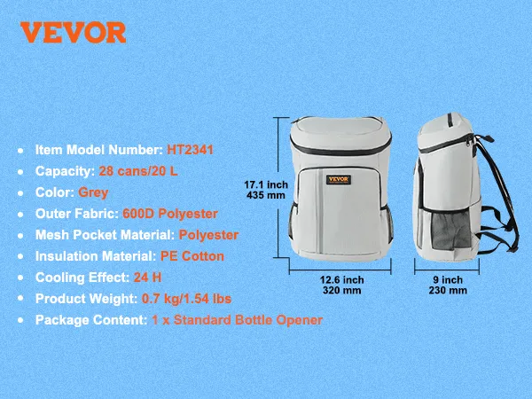 Made from 600D nylon material and a 7 mm PE foam layer, our backpack cooler keeps your drinks chilled and food warm up to 24 hours. With a capacity of 28 cans/20L, it packs everything you need for your outdoor. It is also waterproof and leakproof! Take our versatile cooling backpack on the way!