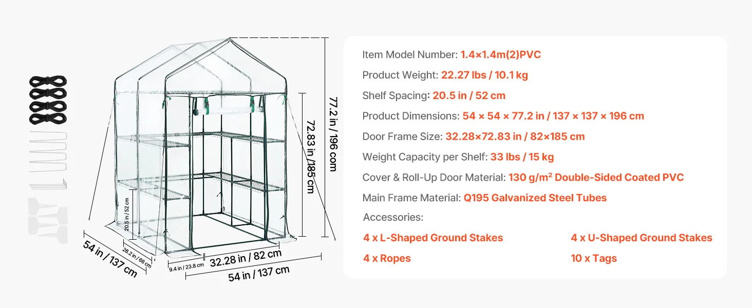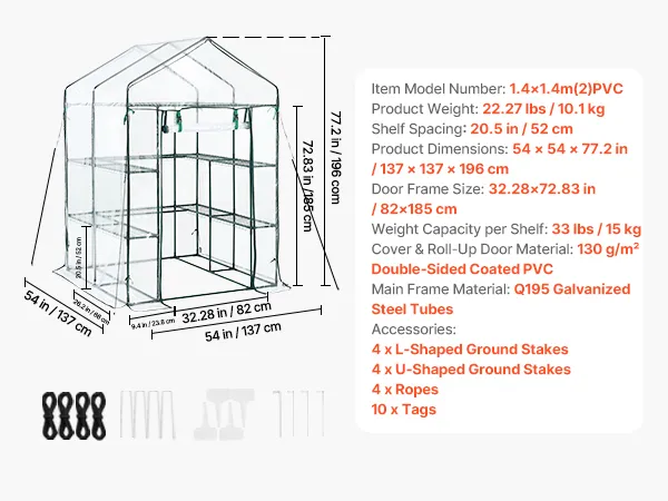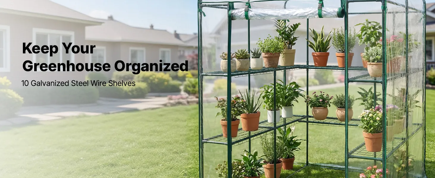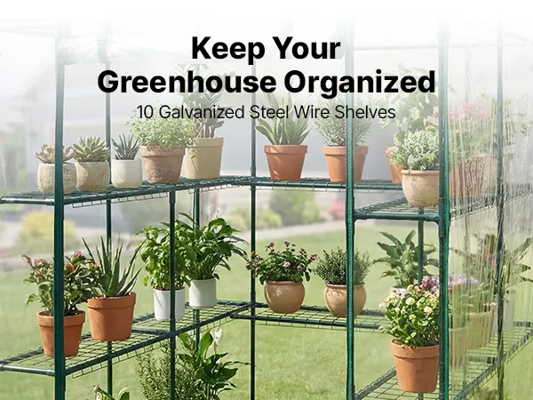 Expanded Storage Space: Our walk-in plant greenhouse features two tiers with a total of 10 shelves to maximize vertical storage. Each wire shelf supports up to 33 lbs and includes securing ties for added stability