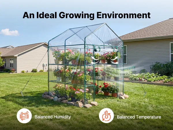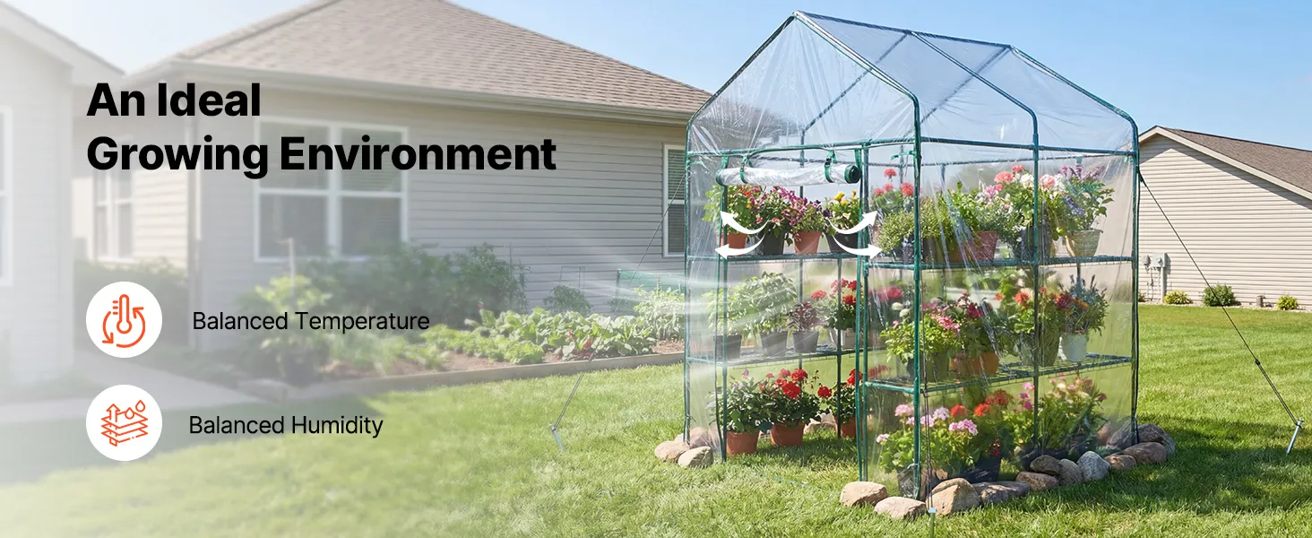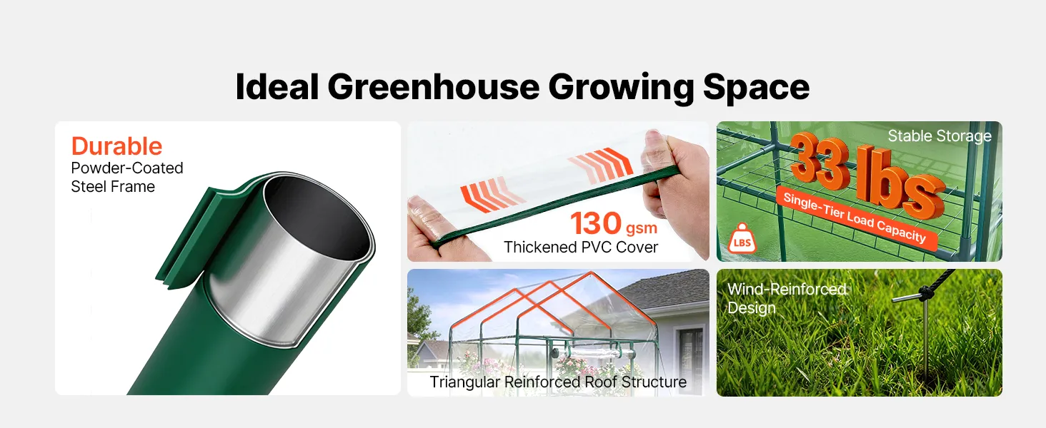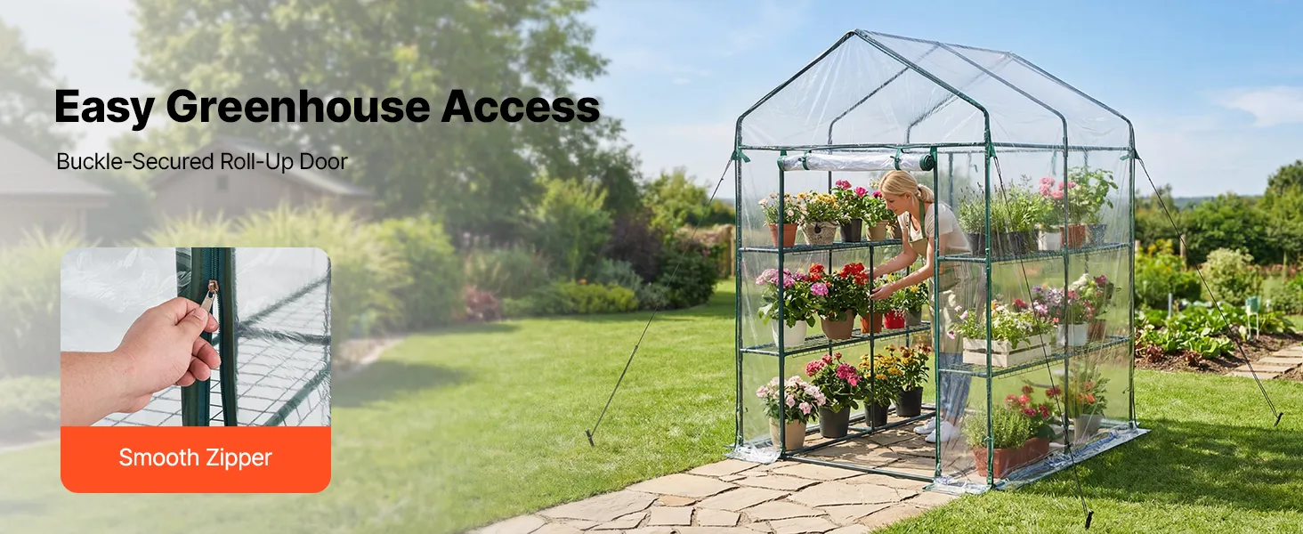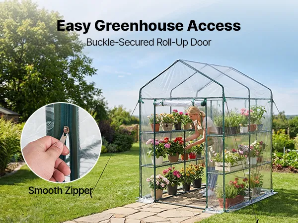 Optimal Growing Environment: The walk in green house uses a 130 gsm PVC clear cover that allows sufficient sunlight while providing insulation, Level 6 sun protection, and water resistance. The zipper roll-up door with straps promotes airflow