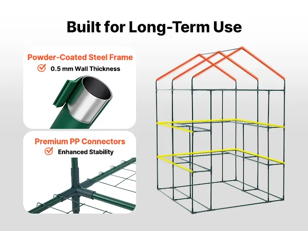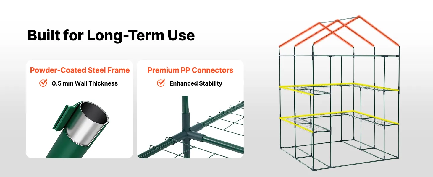 This walk-in greenhouse frame is constructed from high-strength powder-coated steel tubing for enhanced strength. It resists bending and corrosion for long-term outdoor use.