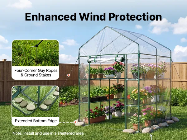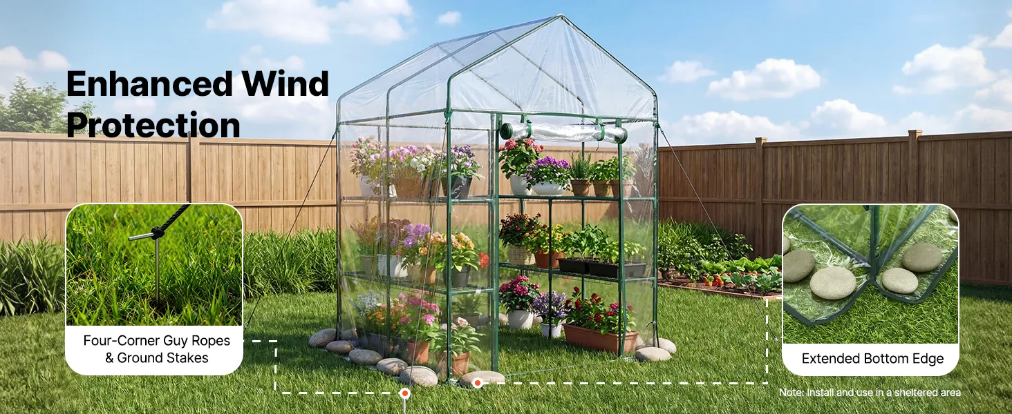 Our walk-in plant greenhouse includes an extended bottom cover for added stability. You can weigh it down with stones or flowerpots to reinforce the structure.