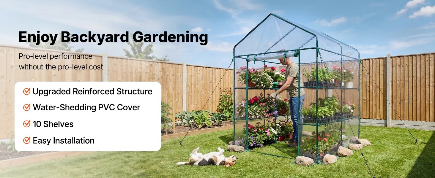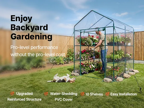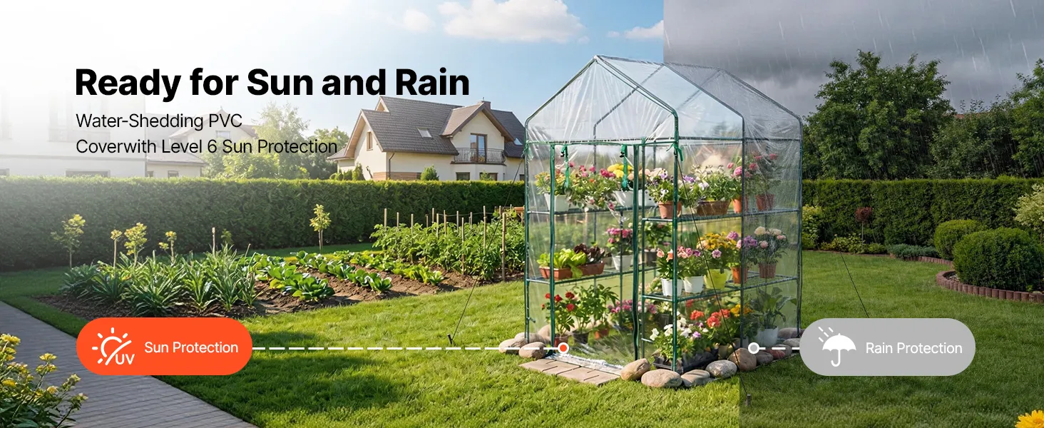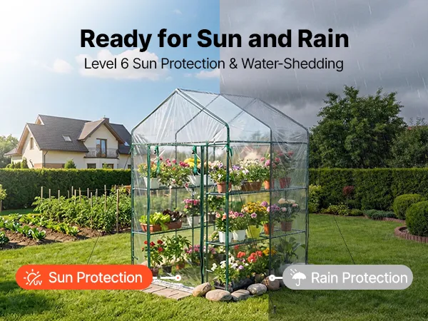 The portable walk-in greenhouse features a double-sided PVC-coated cover that sheds rain and provides Level 6 sun protection. Reinforced stitching reduces tearing and extends service life.