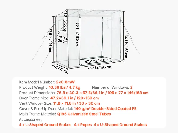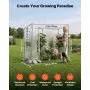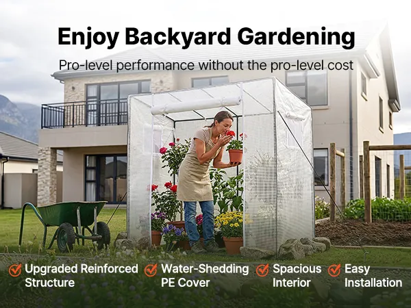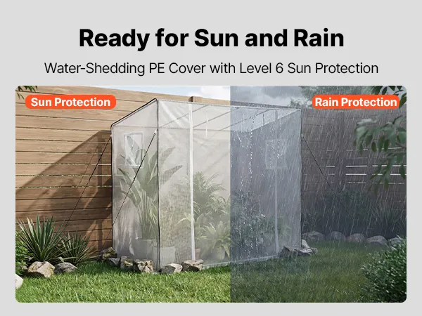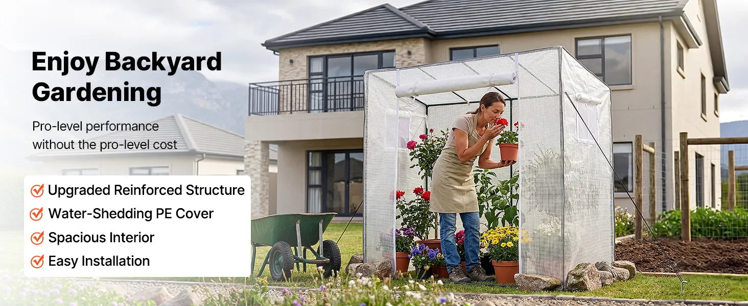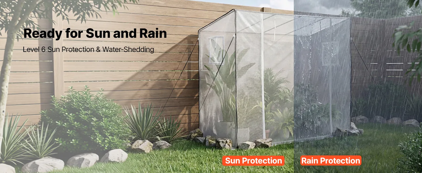 The portable walk-in greenhouse features a double-sided PE-coated cover that sheds rain and provides Level 6 sun protection. Reinforced stitching reduces tearing and extends service life.