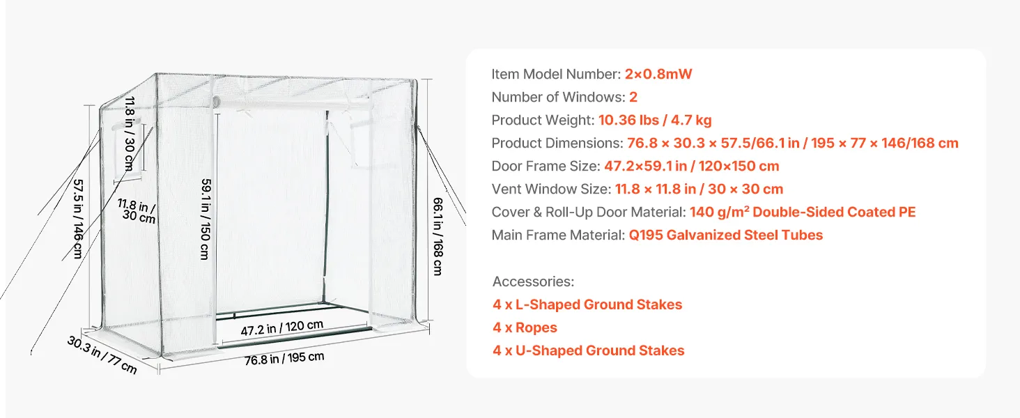 Compact Walk-in Greenhouse: The greenhouse features a sloped roof to avoid water buildup. Measuring 76.8 x 30.3 x 66.1 in, it provides ample space for vegetables, flowers, and potted plants, allowing easy watering. Note: Install it in a sheltered location