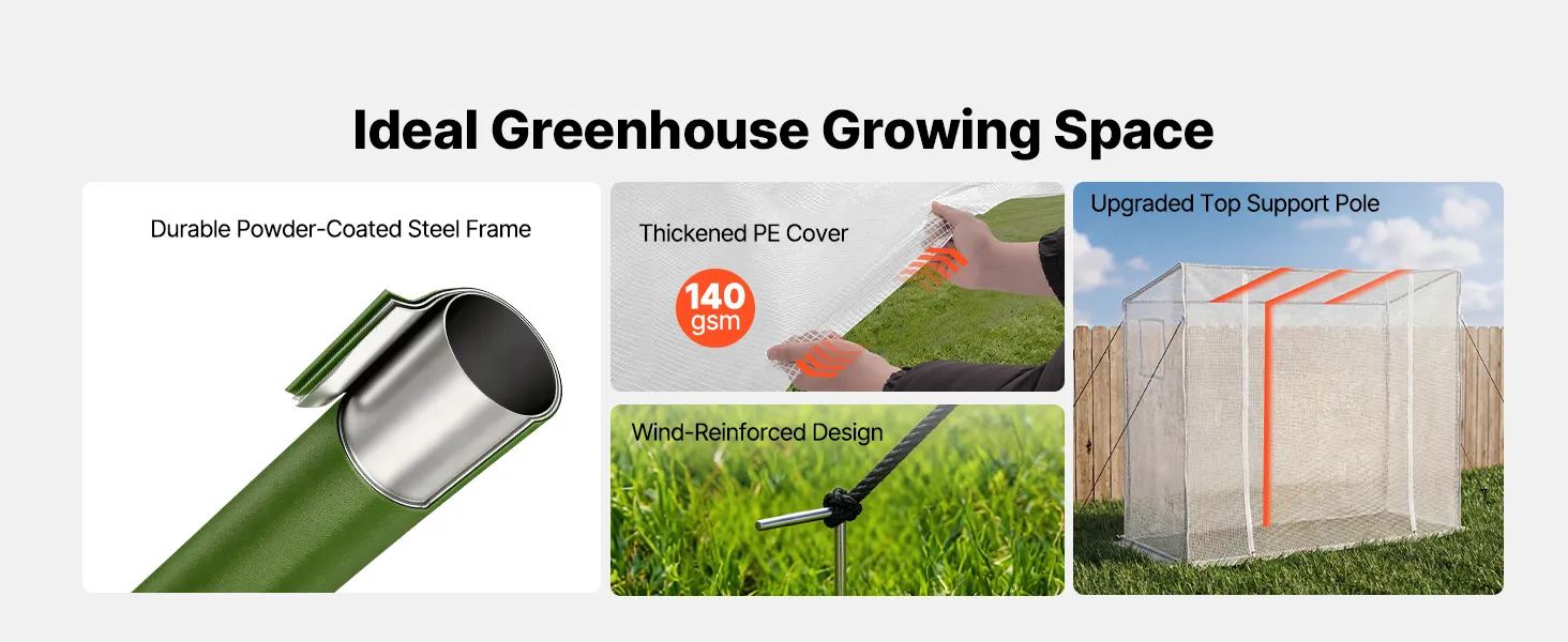 Optimal Growing Environment: Our walk-in plant greenhouse uses a 140 gsm PE cover that allows sufficient sunlight while providing insulation, Level 6 sun protection, and water resistance. The durable PE material resists tearing for long-term outdoor use