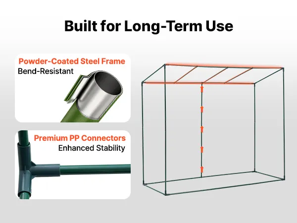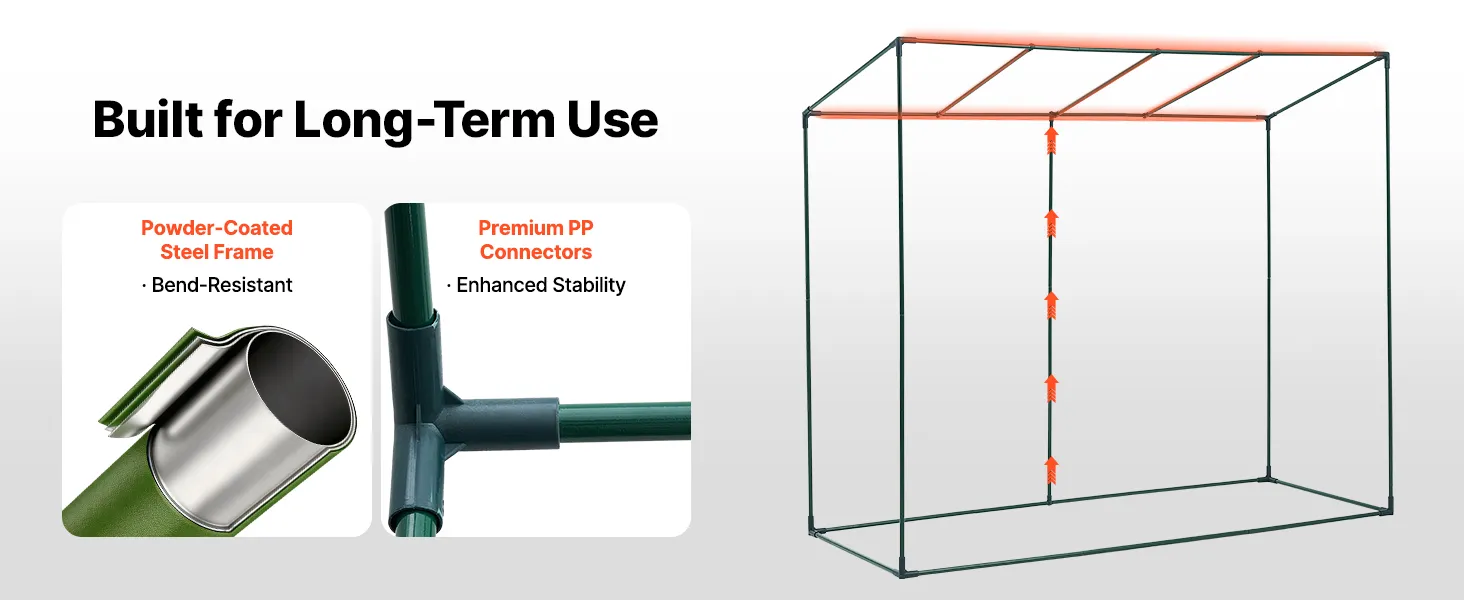 This walk-in greenhouse frame is constructed from high-strength powder-coated steel tubing for enhanced strength. It resists bending and corrosion for long-term outdoor use.