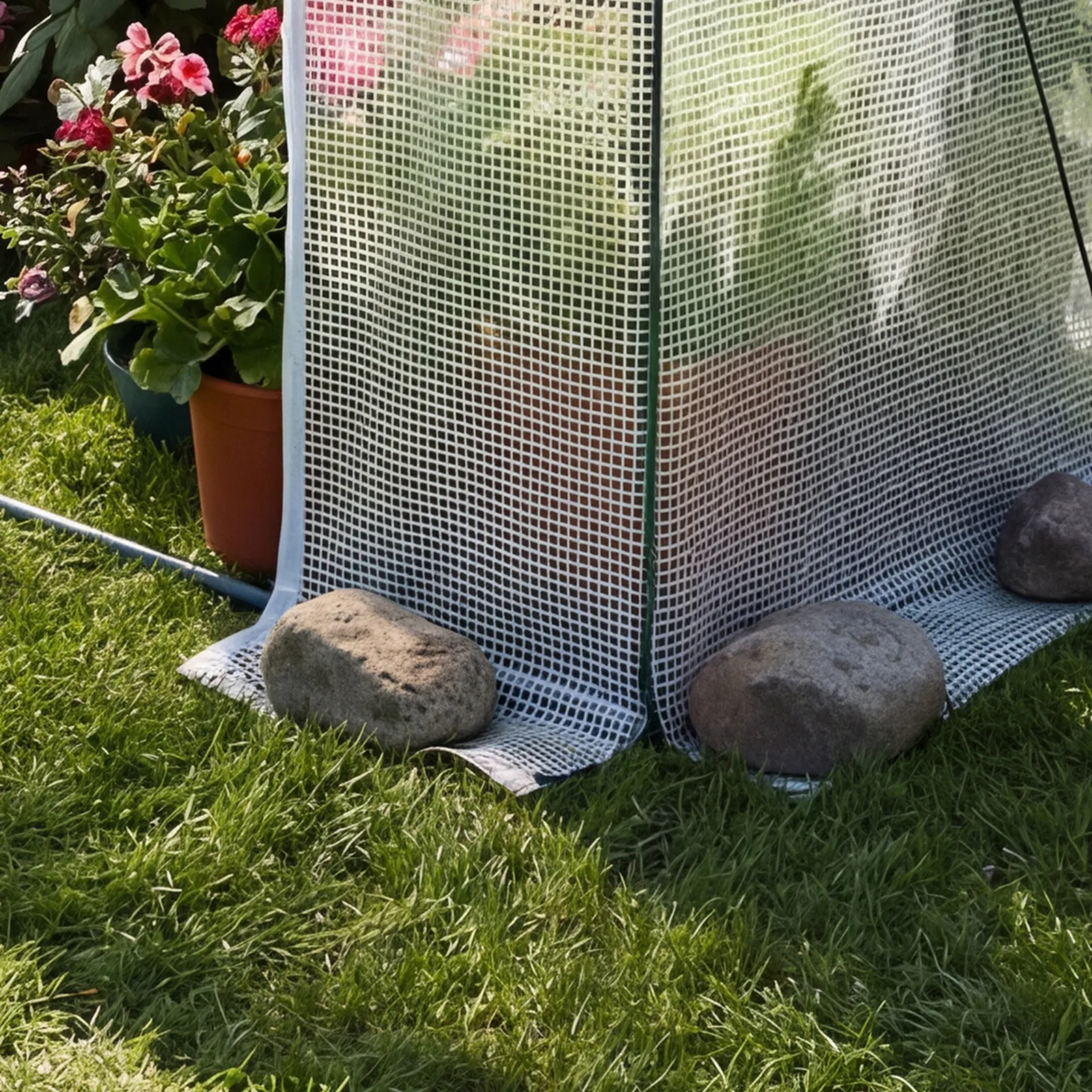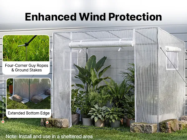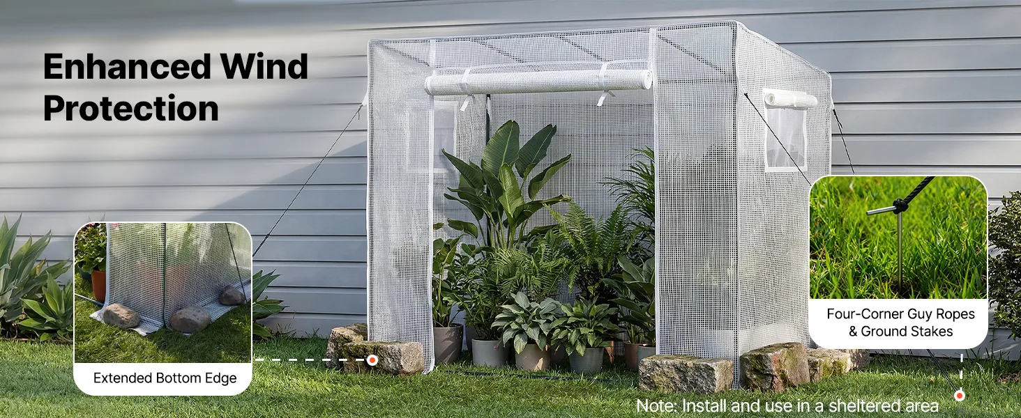 Our walk-in plant greenhouse includes an extended bottom cover for added stability. You can weigh it down with stones or flowerpots to reinforce the structure.