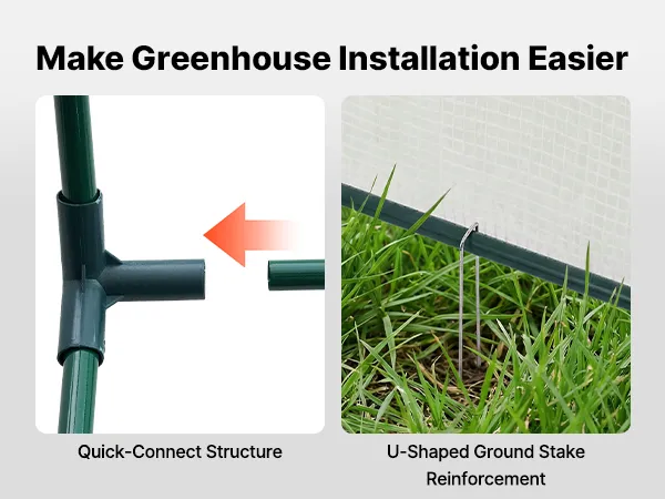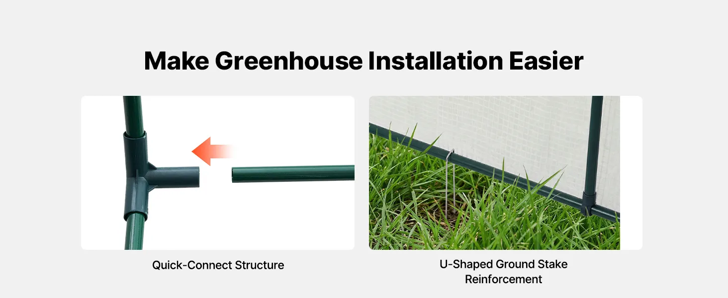 Easy Assembly: The walk in greenhouse includes clear instructions and a quick-connect frame for simple setup without complicated tools. U-shaped ground stakes help secure the base firmly. The extended bottom edge allows added weight for extra stability