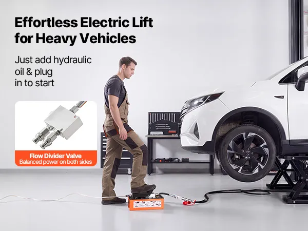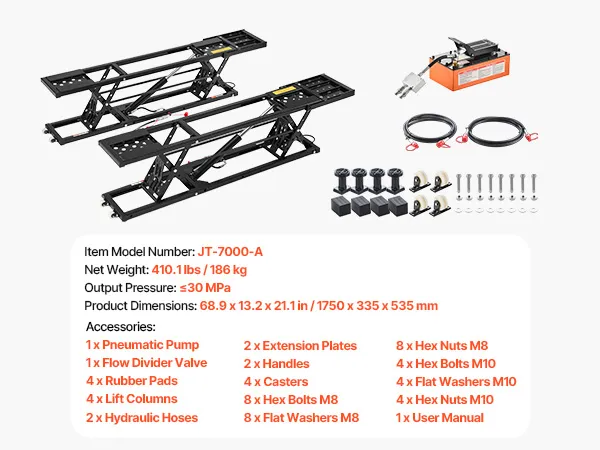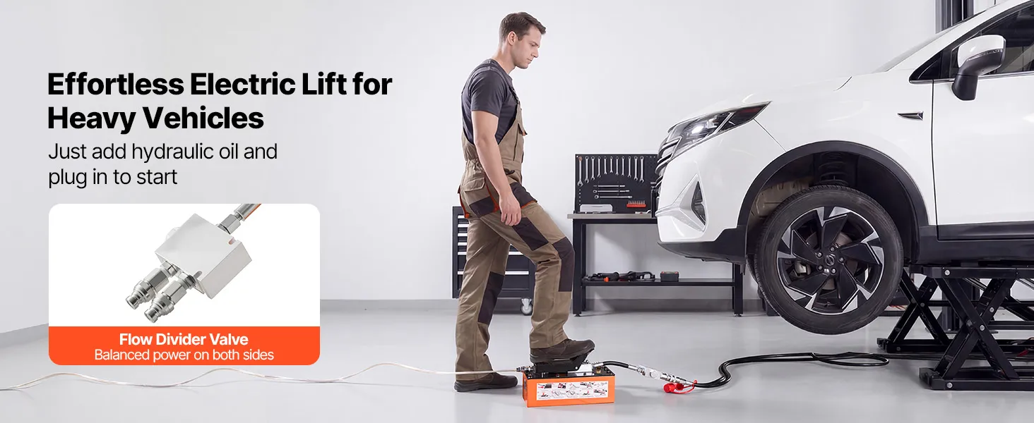 Pneumatic Lifting: The vehicle lift uses a pneumatic hydraulic pump with a flow divider valve. Connect to an air compressor (not included) to evenly supply air to both cylinders. Before use, open the bleeder valve & fill with IOS46# hydraulic oil