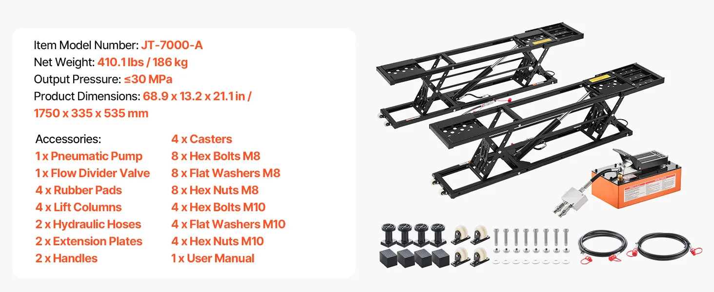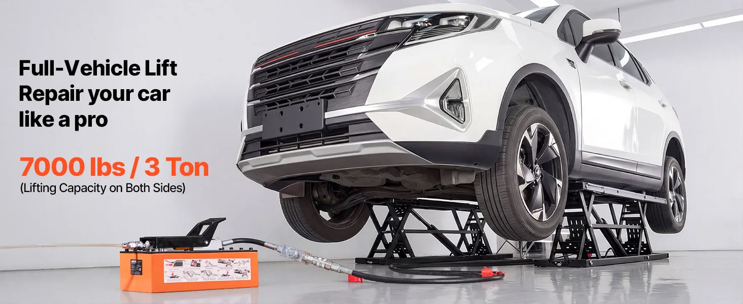 7000 lbs Lifting Capacity: Built with reinforced alloy steel, this portable car lift supports up to 7000 lbs (3 tons). Suitable for EVs, long-wheelbase vehicles, trucks, and SUVs, it lifts the whole vehicle and replaces repeated jack lifting