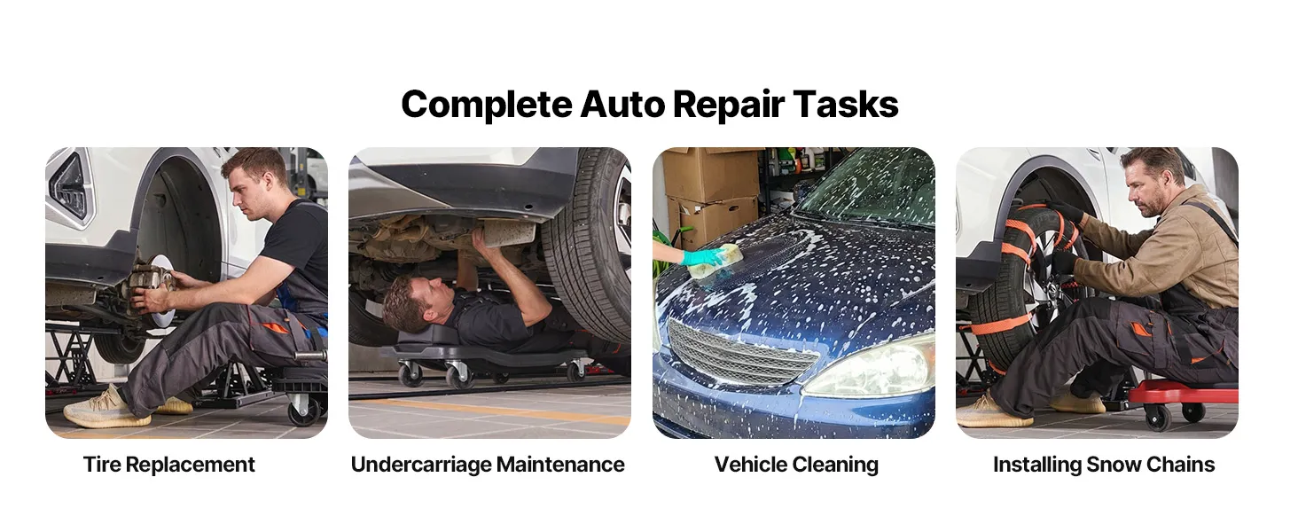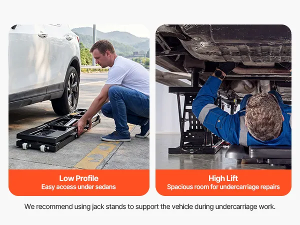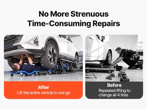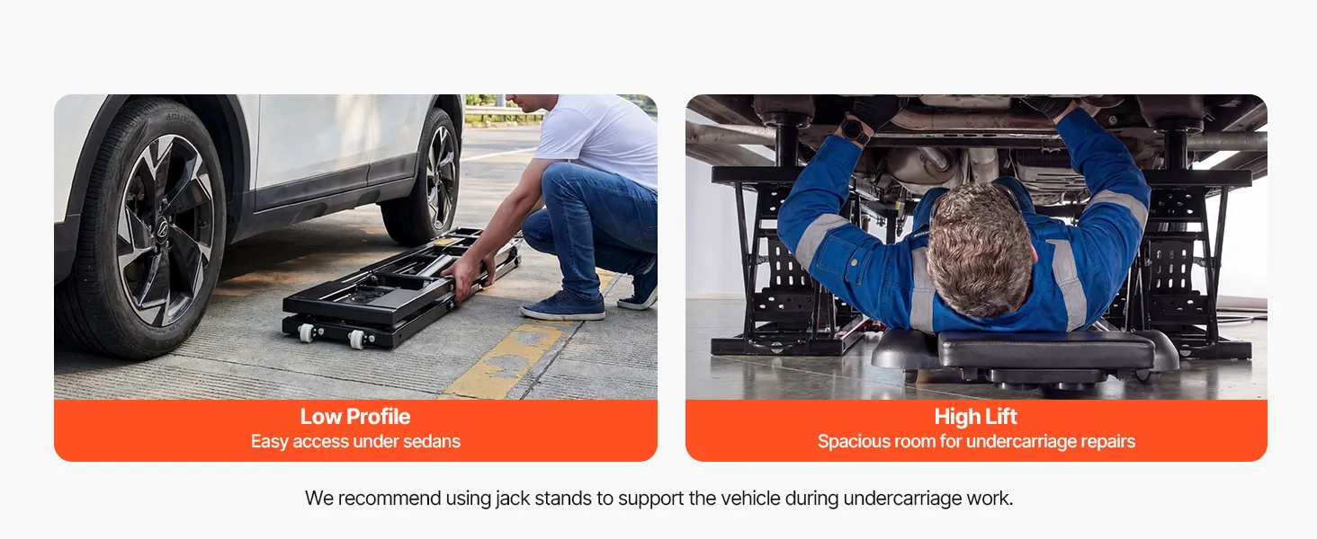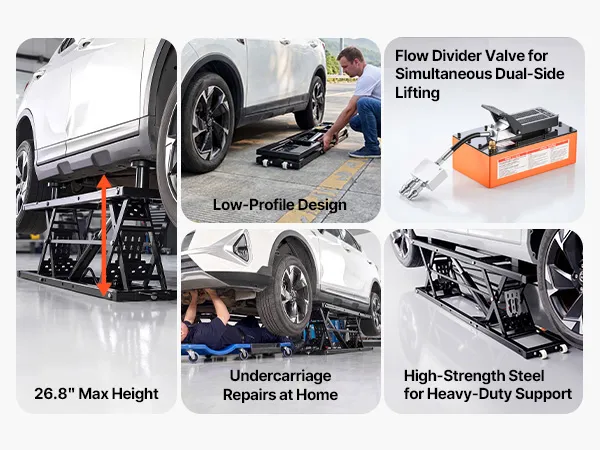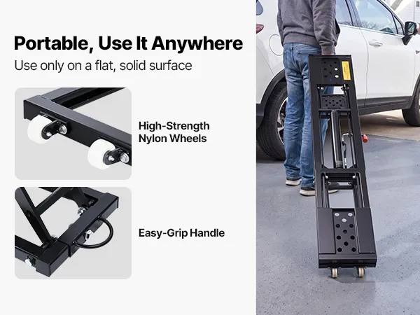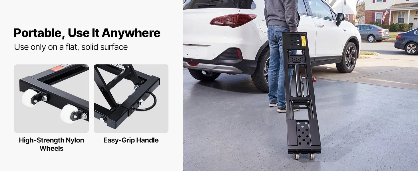 Portable & Mobile: With a low-profile structure, this car lift can be compactly stored in garages or small repair shop corners. It includes nylon casters and handles for easy movement. Note: Use it on flat, solid ground. Slope use is not recommended
