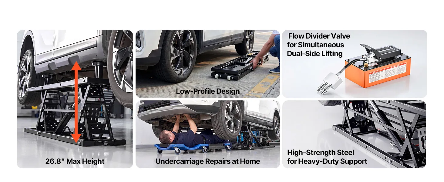 Built with high-strength, thickened steel, this rugged portable car lift delivers powerful support for heavy vehicles. It enables undercarriage repairs, tire changes, brake maintenance, and thorough vehicle cleaning.