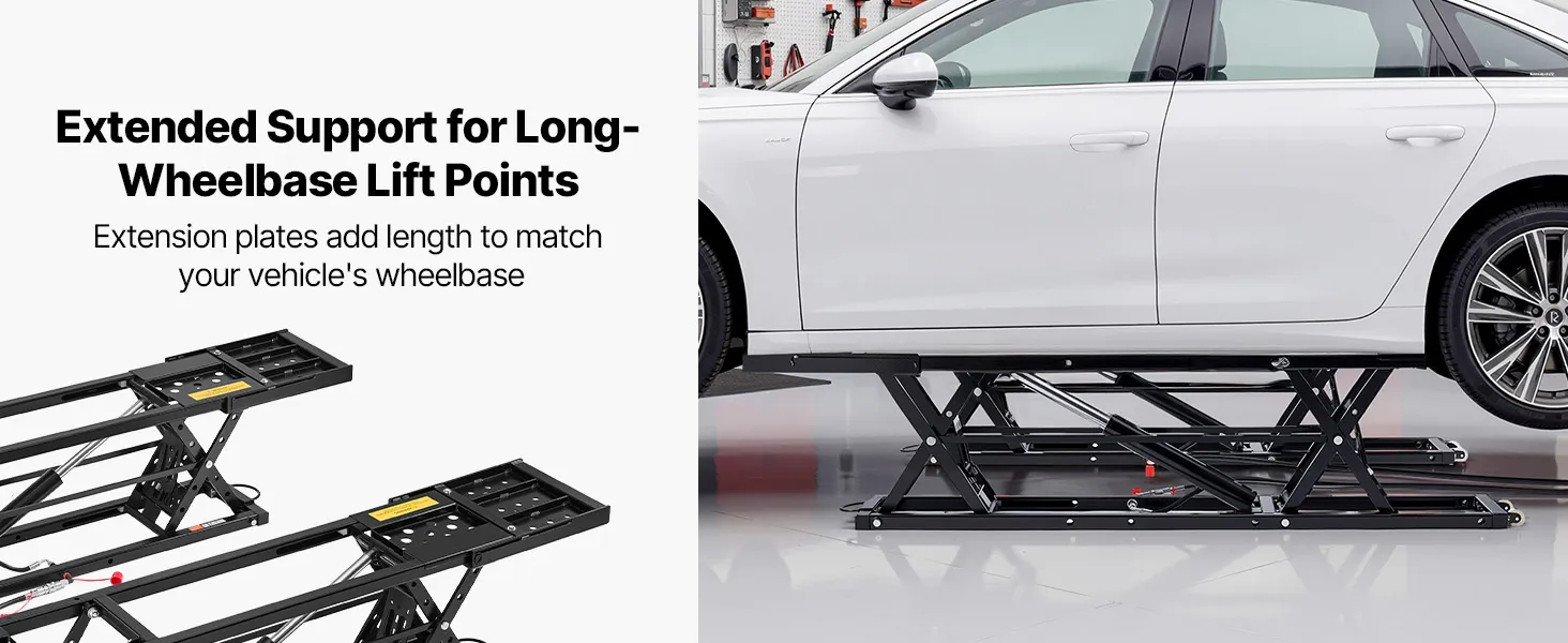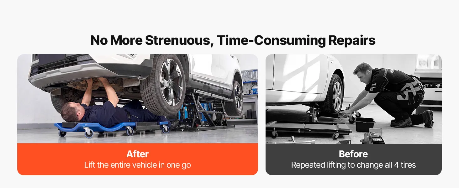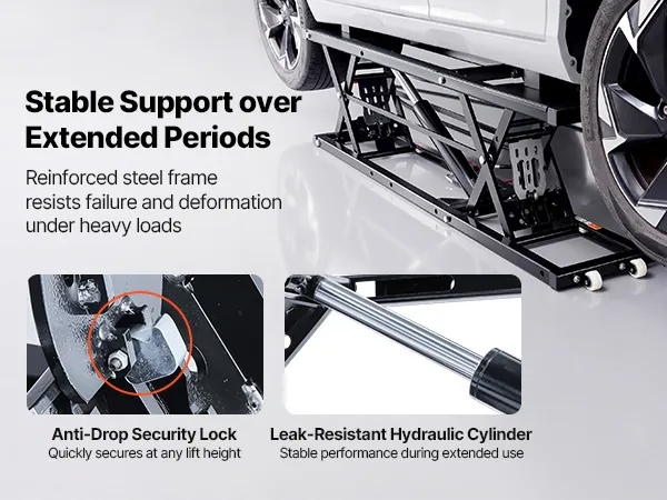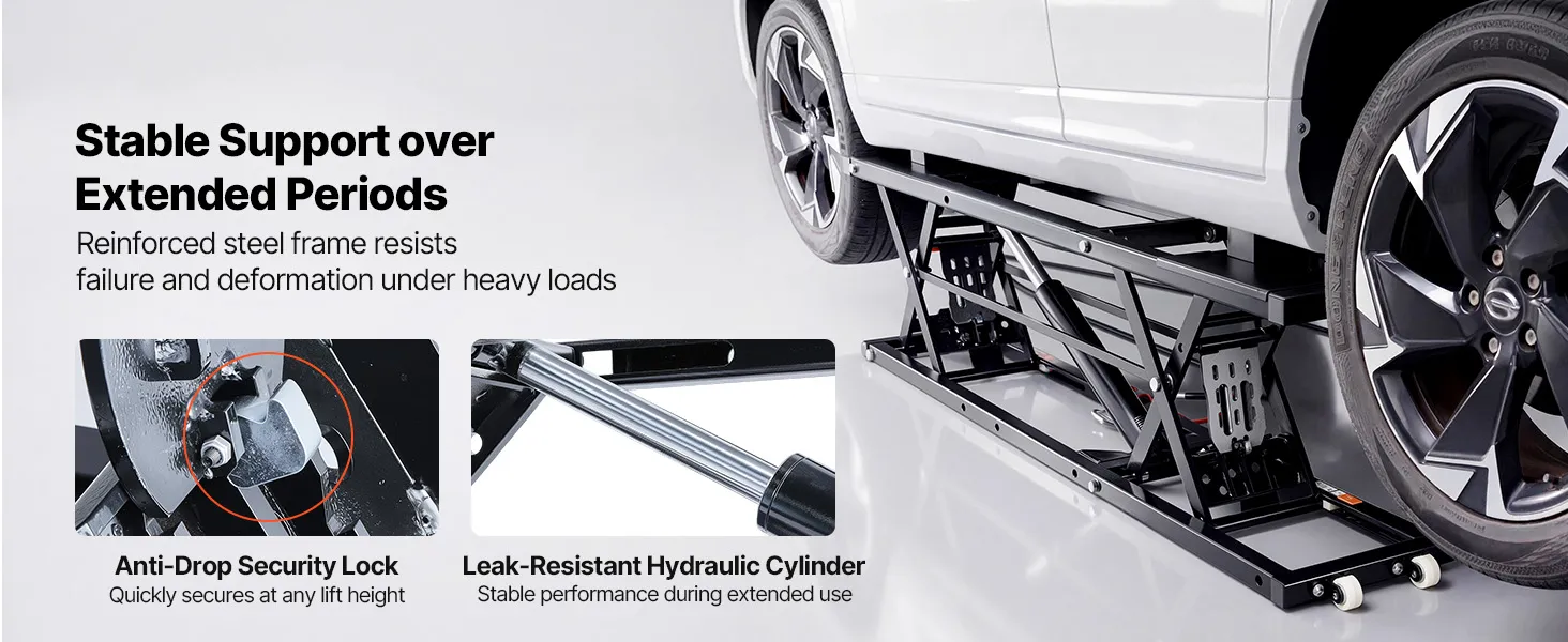 Mechanical Security Lock: For stable support, the car scissor lift features a mechanical lock that securely locks at each height. Combined with a sealed hydraulic cylinder, it provides fast lifting and controlled lowering, ensuring security with every use