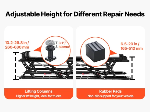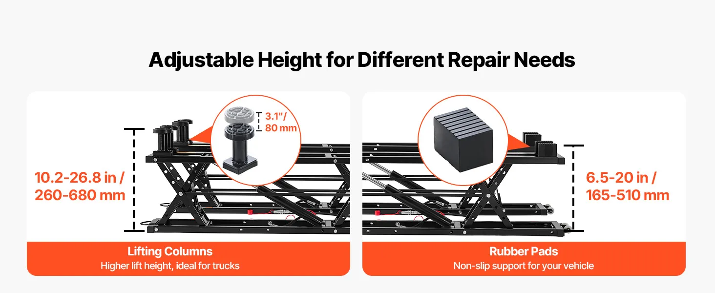 Adjustable Height: Our scissor car lift includes 4 non-slip rubber pads and 4 lift columns. Lifting range is 6.5–20 in (165–510 mm) with pads and 10.2–26.8 in (260–680 mm) with columns. It adapts to different repair heights while safely lifting vehicles