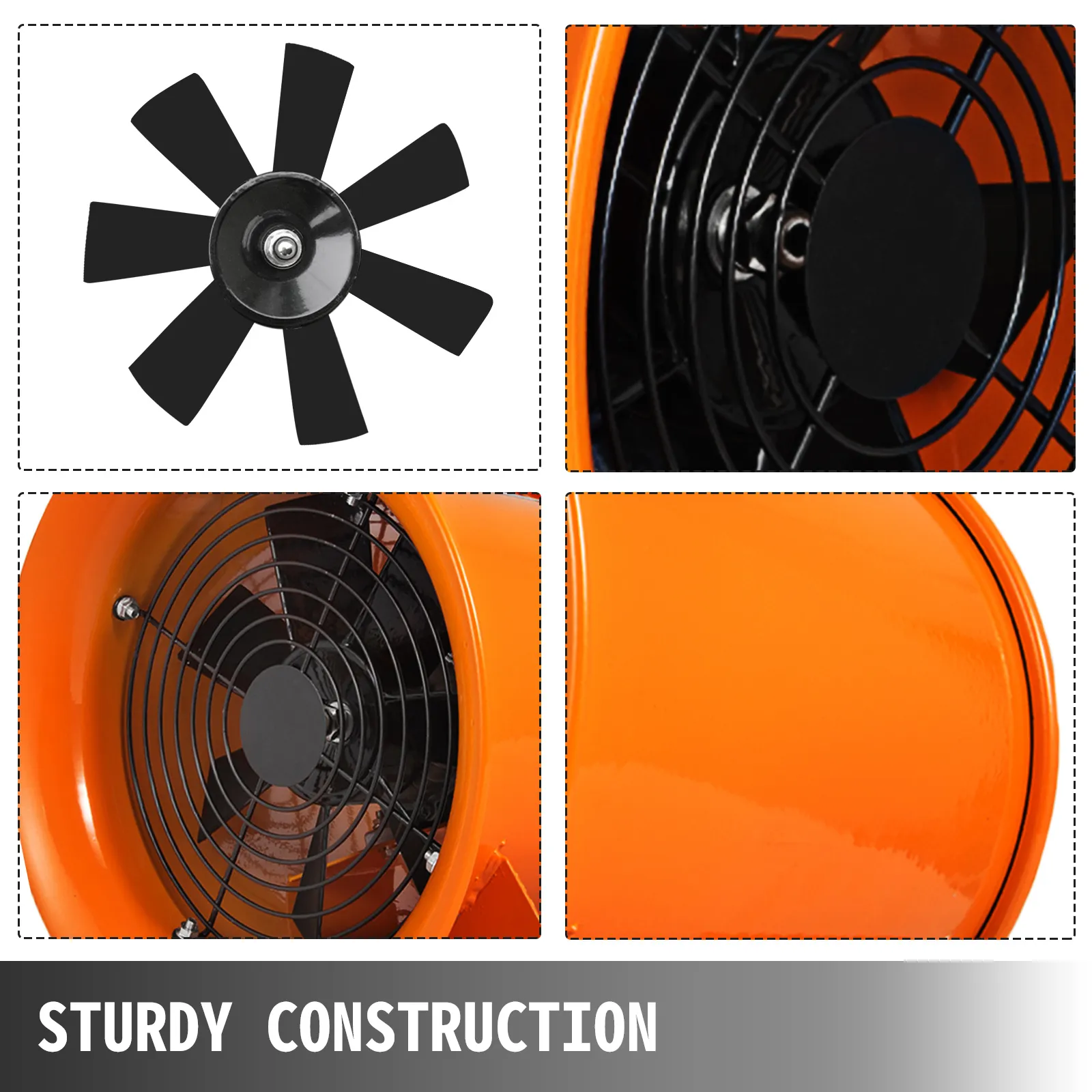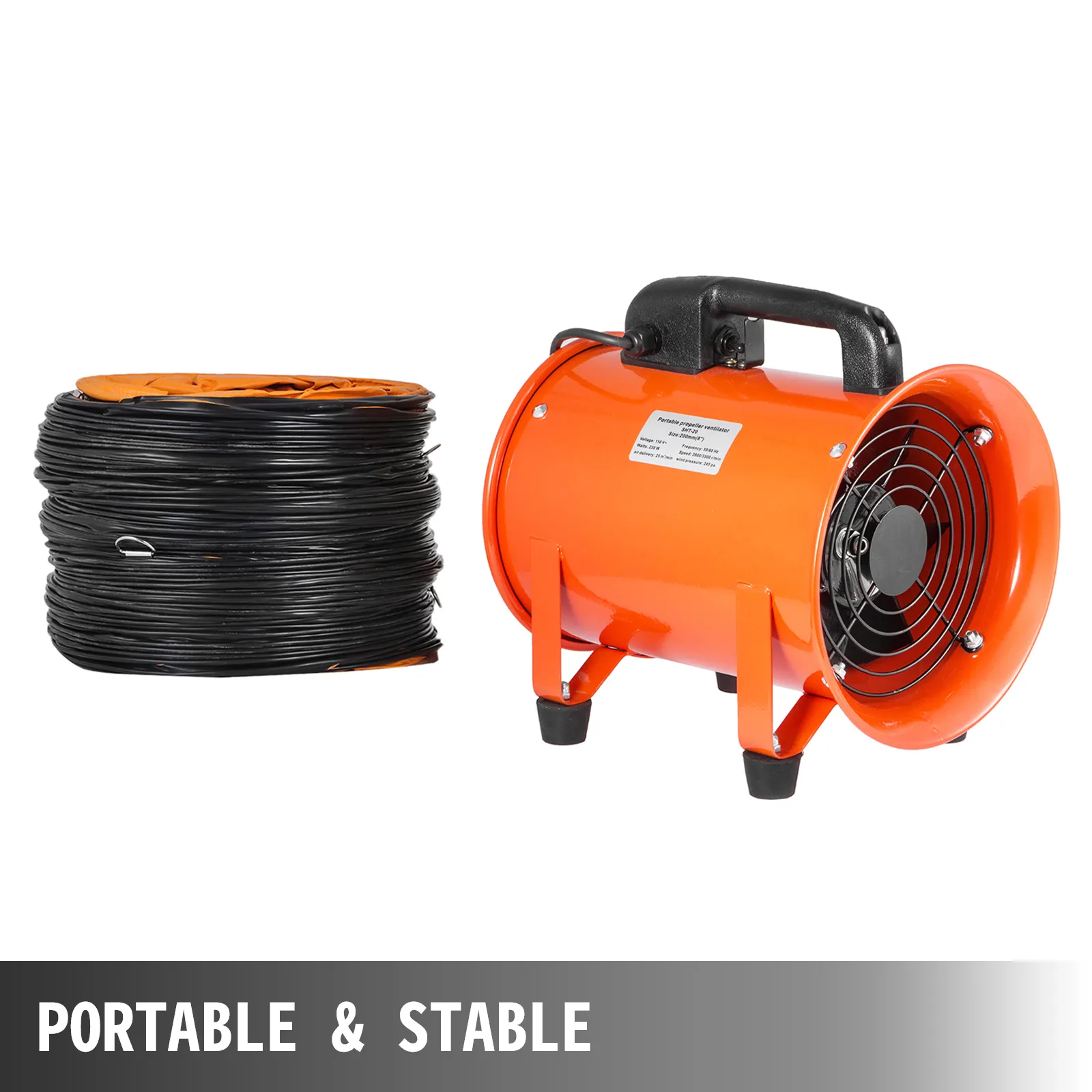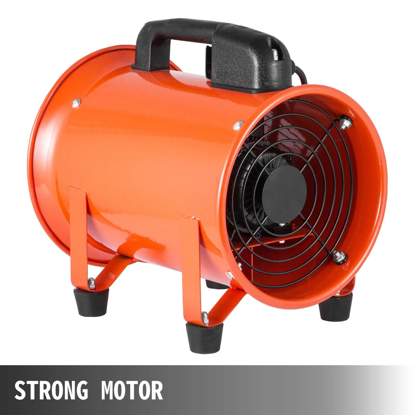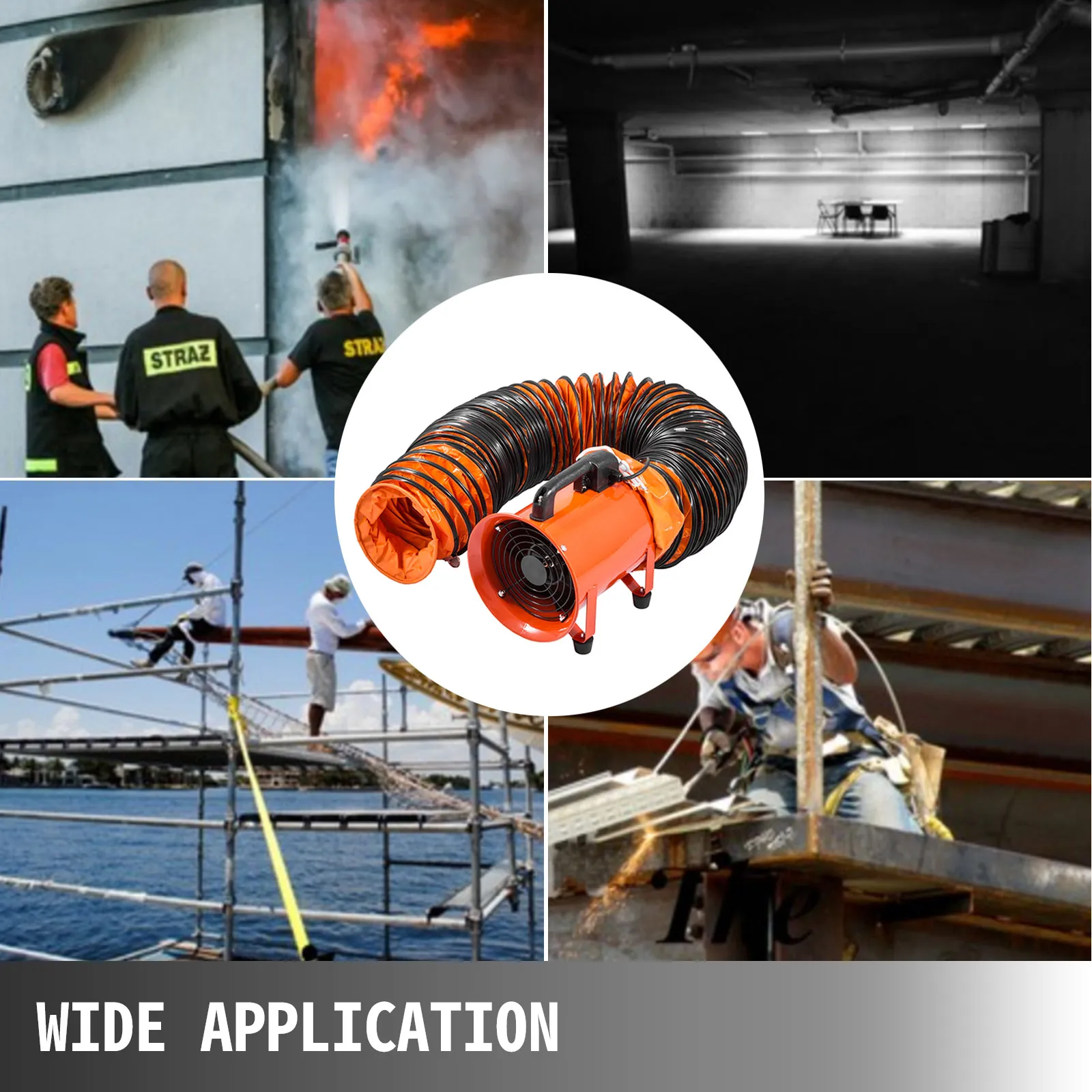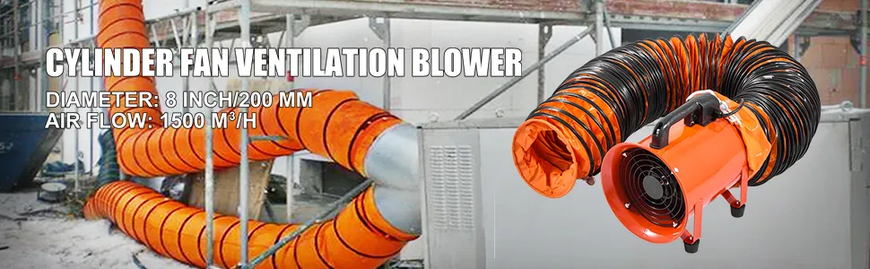 This 8'' / 200 mm utility blower extractor fan is used for intake or exhaust, depending on which end the hose is connected to (intake or outtake). 882 CFM / 1500 m³/h large air volume, 2800 / 3300 r/min motor speed, and a 32.8 ft / 10 m flexible PVC ducting can provide high working efficiency and directional airflow to limited access areas. It is the ideal ventilation fan for factories, basements, shipyards, farms, grain storage, warehouse, kitchen, office, workshops, tobacco, tunnel, automobile manufacturing, and more places requiring ventilation.