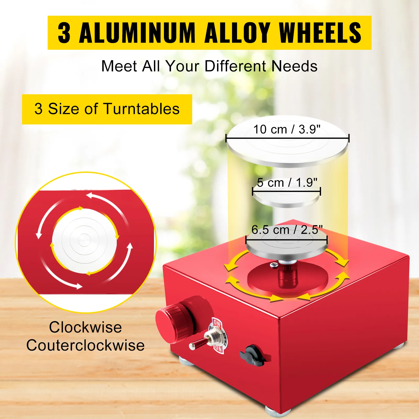 This mini pottery machine provides 3-sized aluminum alloy turntables, detachable for easy cleaning, and never rusts, allowing users to do various artworks efficiently. Forward and reverse rotation can meet the different habits of users.