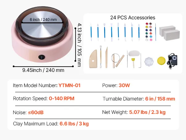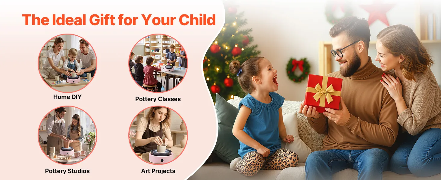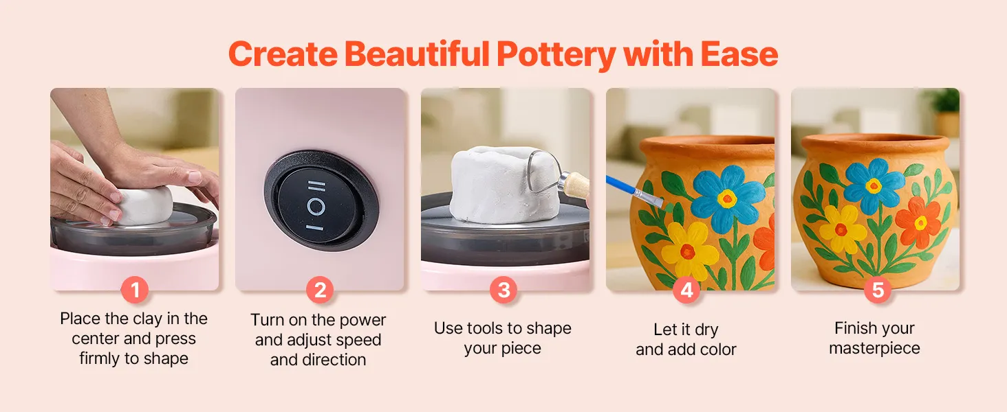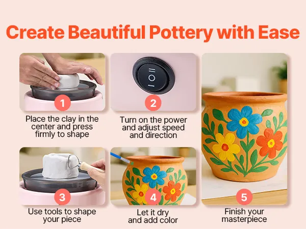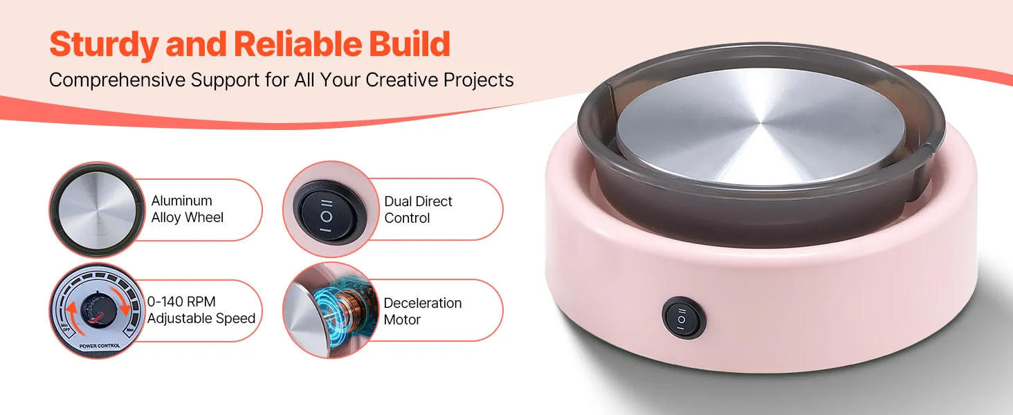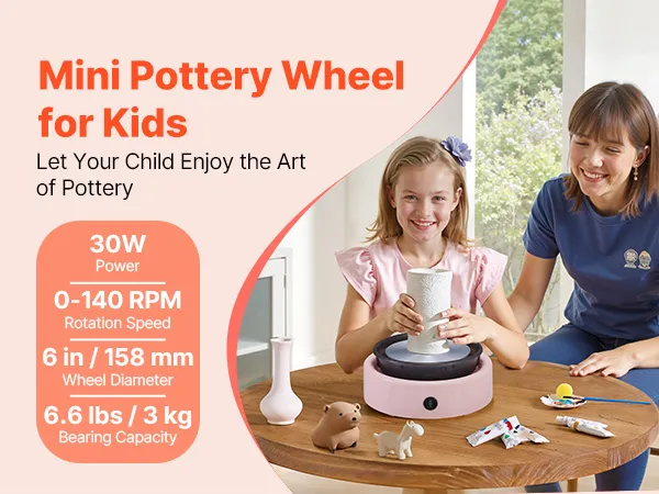 Mini Pottery Wheel for Kids: This portable mini pottery wheel features a powerful 30W motor and a sturdy 6 in aluminum turntable. It encourages creativity, imagination, and hands-on skills while enhancing parent-child bonding through artistic fun