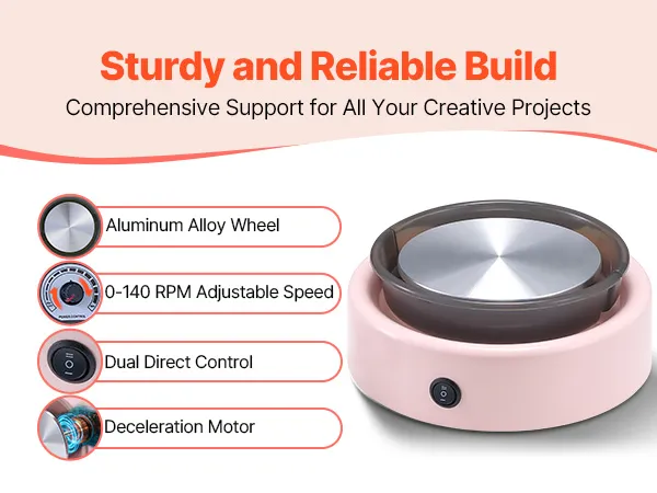Smooth & Flexible Control: The clay wheel features easily 0–140 RPM speed control with a single knob. Switch between clockwise and counterclockwise spin to match different shaping styles. The quiet deceleration motor ensures smooth, focused crafting