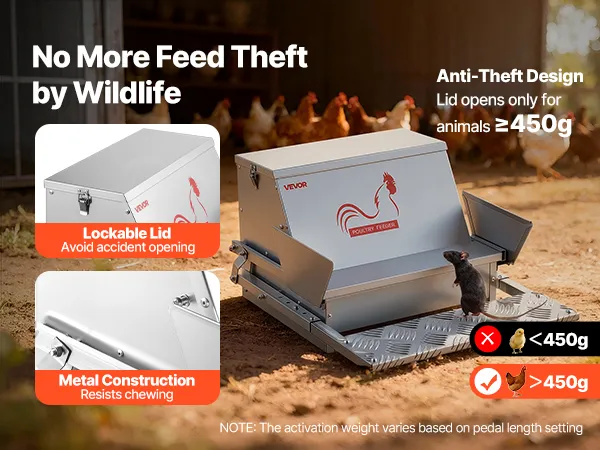 With a theft-proof treadle design, our treadle chicken feeder supports only animals over 450g that can access the food. It keeps smaller animals like squirrels and birds from stealing the feed.
