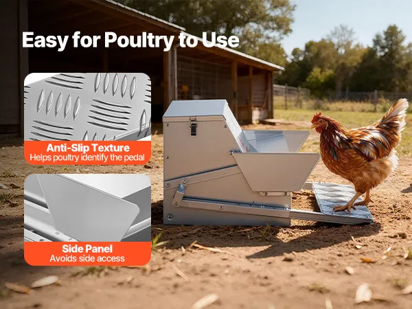 Automatic Treadle Feeder: This metal automatic chicken feeder opens when poultry ≧450 g step on and closes when they leave. The lockable lid blocks small rodents from the feed. The soundproof strip reduces noise while the metal body resists chewing