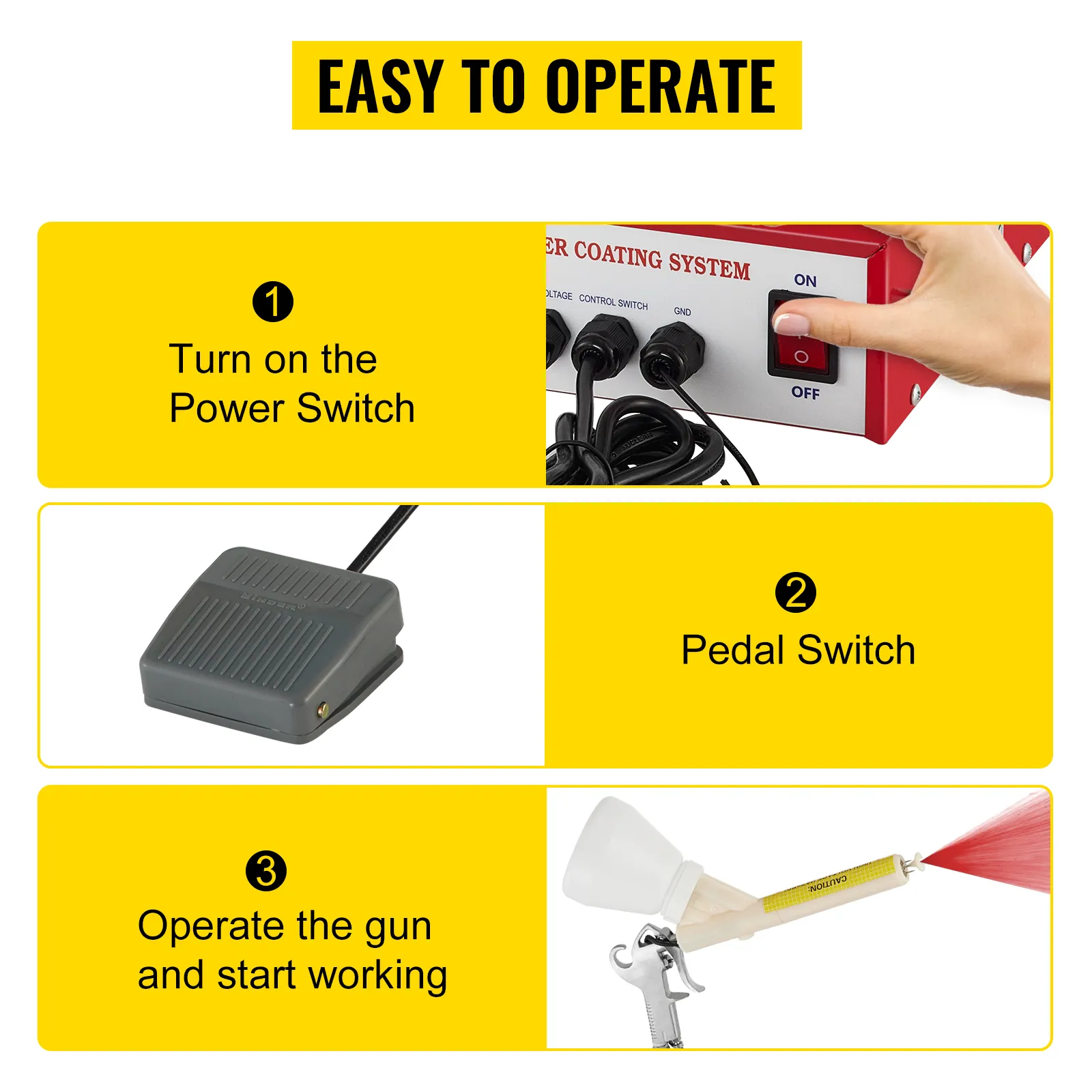 There are only three steps to start this machine: turn on the power, step on the pedal, and press the spray gun's trigger. Also, you can adjust pressure through the foot pedal.