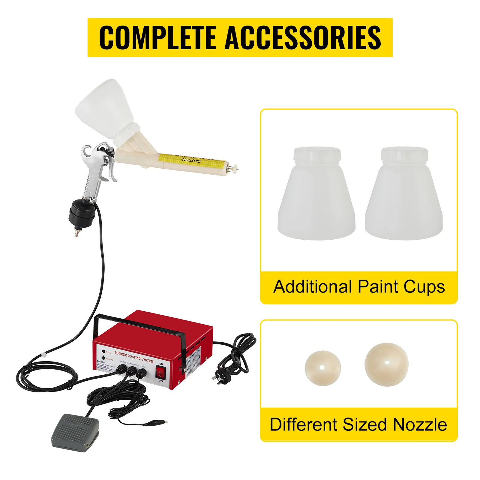 The premium power cable, made of high-quality materials, features good corrosion resistance, excellent wear-resistant trait, and good flexibility, which gives you high mobility and a wide range. In addition, there are two paint cups and two nozzles for easy operation.