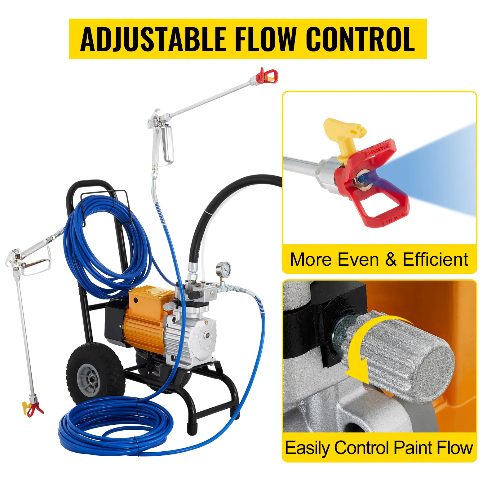 • High-Efficiency Airless Technology: The paint sprayer features strong airflow and a powerful 5 HP 3000W DC motor to ensure great productivity, guarantee a more-consistent finish and decrease overspray. The max flow rate is 16L/Min. You can also adjust the material flow control knob to increase or decrease the material output quickly.