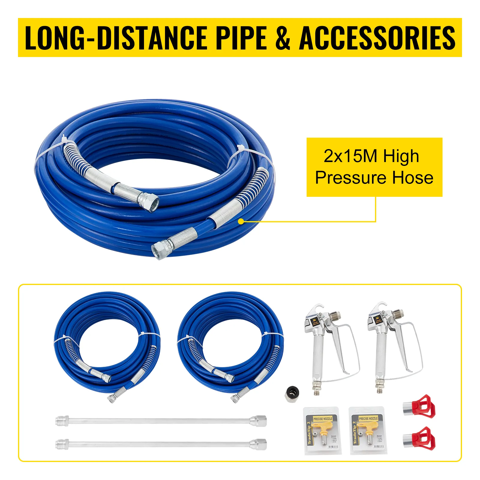 The spray gun is featured with 2 15 m high-pressure hoses to support long-distance projects, giving you even more freedom when it comes to different paint jobs. And we will provide complete accessories for easy operation.