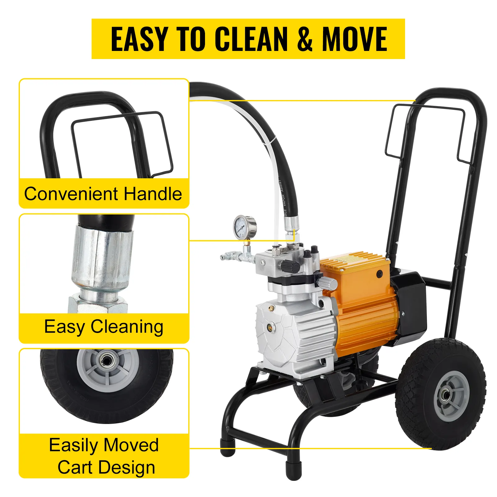 • Easy Cleaning & Durable: The pump is durable that can maximize sprayer life. The spraying equipment with a handle fits comfortably in the user's hand, reducing fatigue. There are two wheels to save effort and increase maneuverability around projects. Meanwhile, the return pipe can ensure a smooth operation.