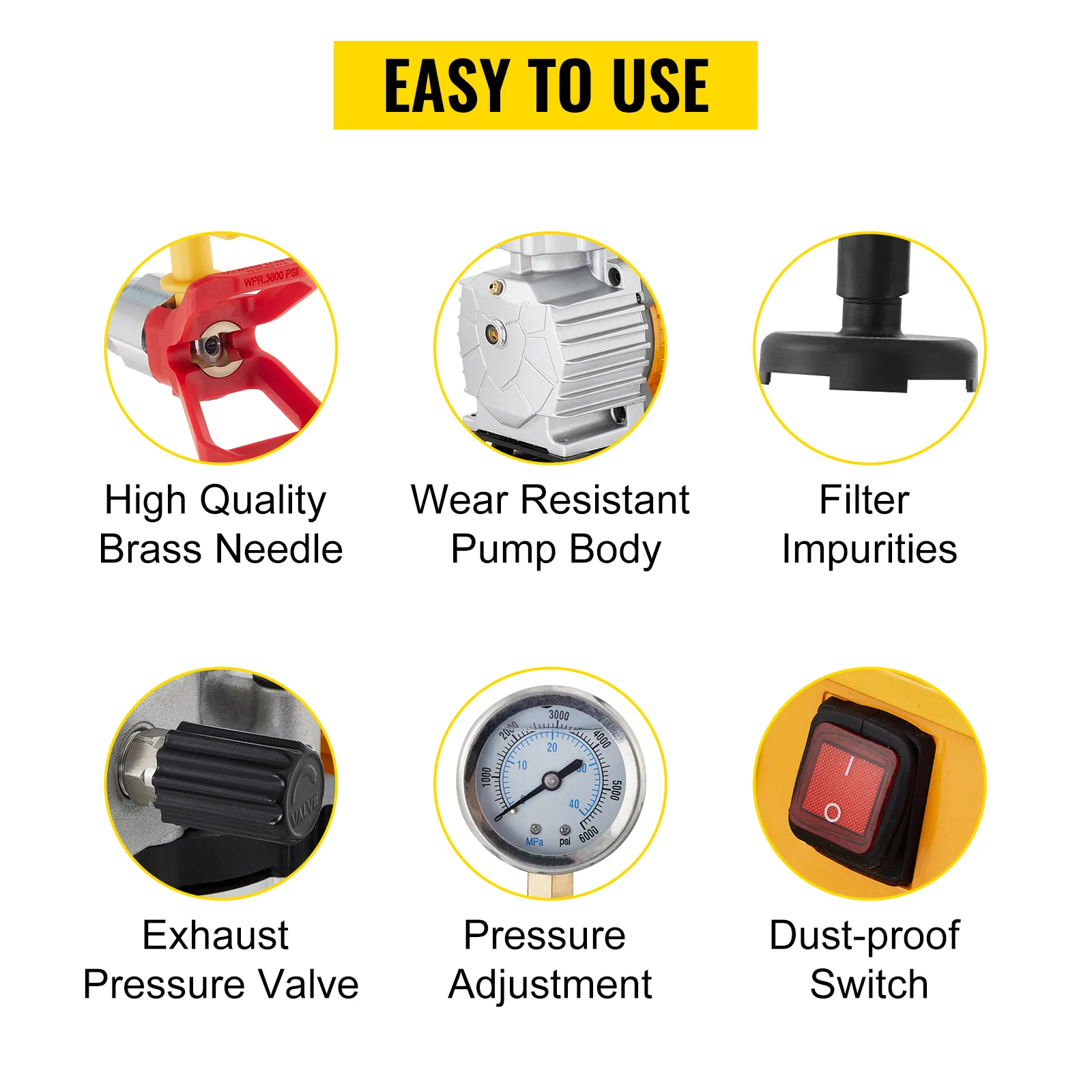 • Airless Paint Sprayer: The painting machine is an easy-to-use sprayer that applies a smooth finish without brush marks. Perfect for painting big projects like home exteriors, fences, decks, garages, furniture, trim and more. It can also spray various materials such as emulsion, latex, enamel, primer, transparent sealant, and varnish.