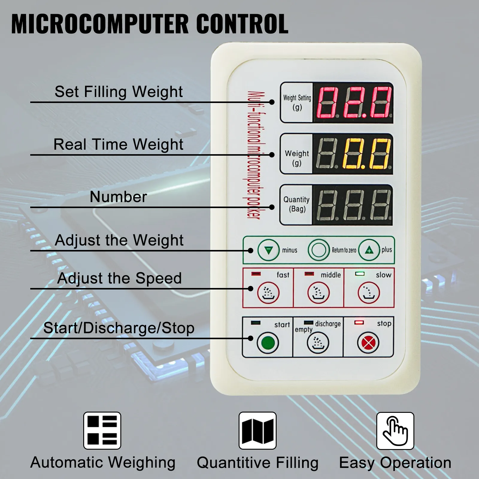 A microcomputer control system makes the weighing and filling process scientific and less error. The LCD screen is easy to operate. You can set your wanted filling weight and filling speed. Digital control will save you a lot of time.