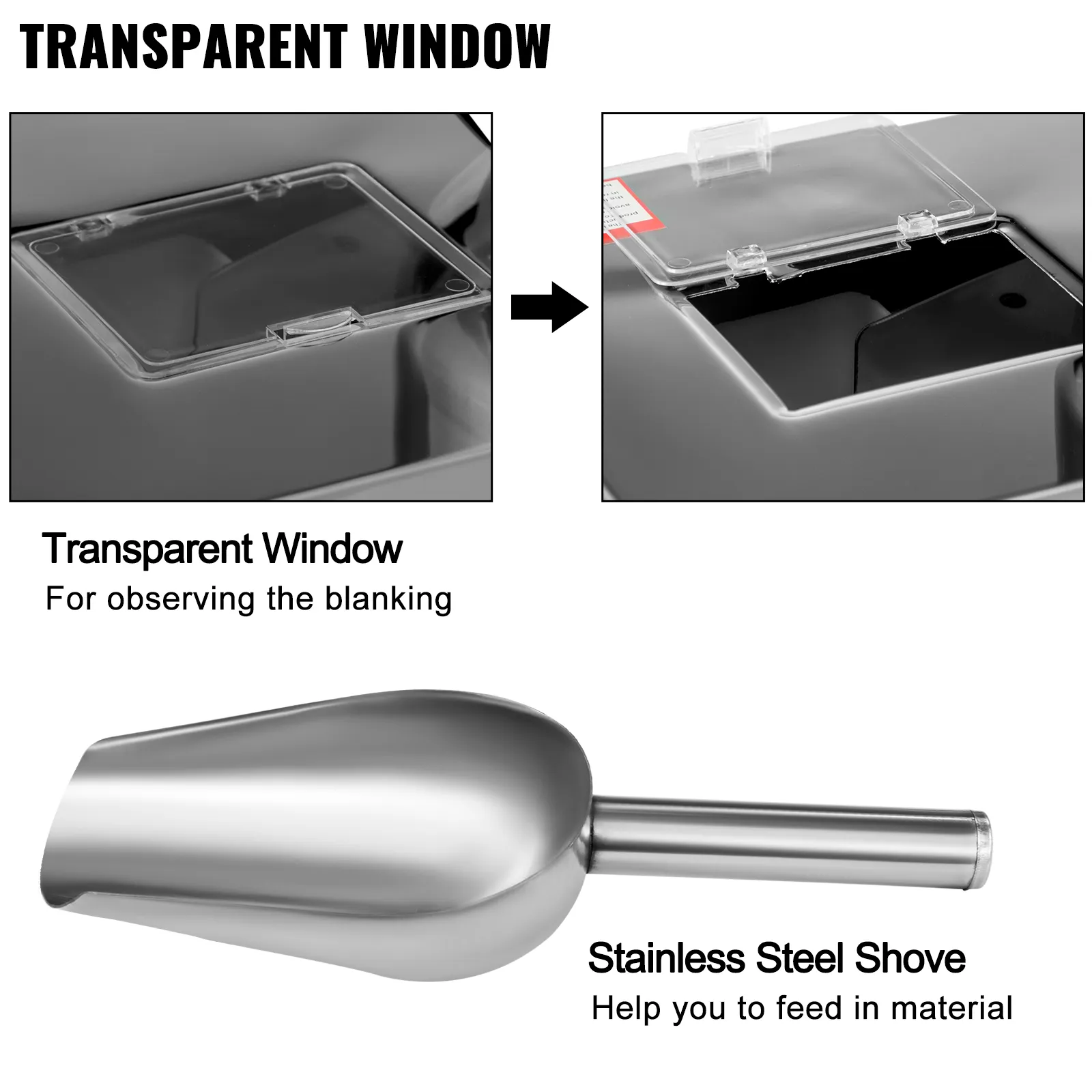You can observe the inside working condition easily with a transparent visible window, which also can be opened if you want. Moreover, the granule filling machine comes with a stainless steel shovel to shovel materials.