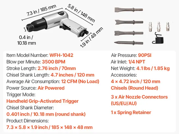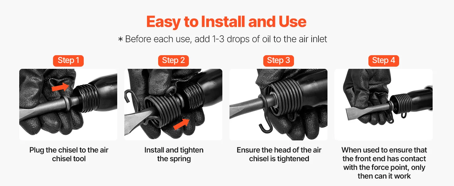 Our pneumatic hammer includes 4 chisels, 3 air nozzle connectors, and 1 spring that holds the chisel securely and allows easy replacement—making installation and operation a breeze.