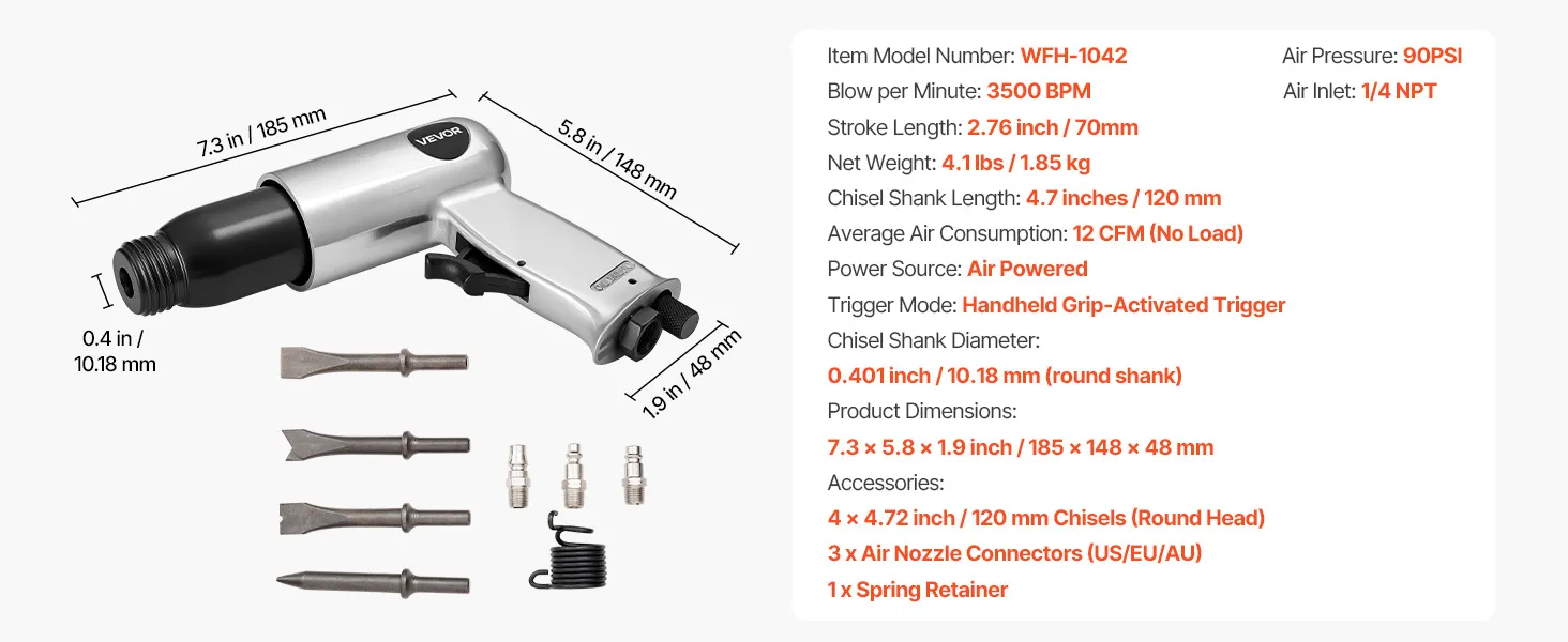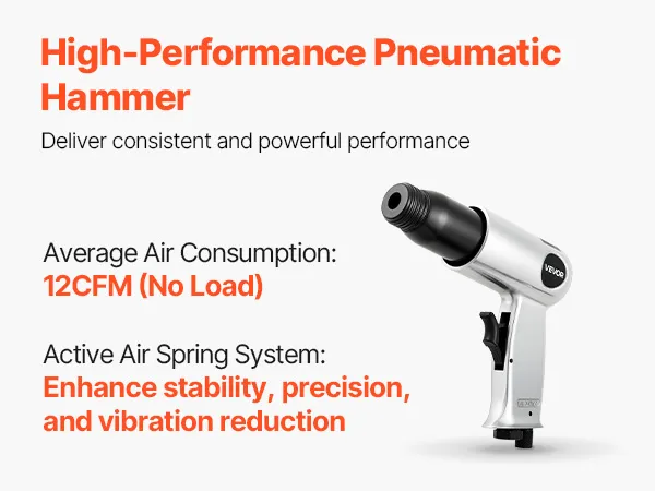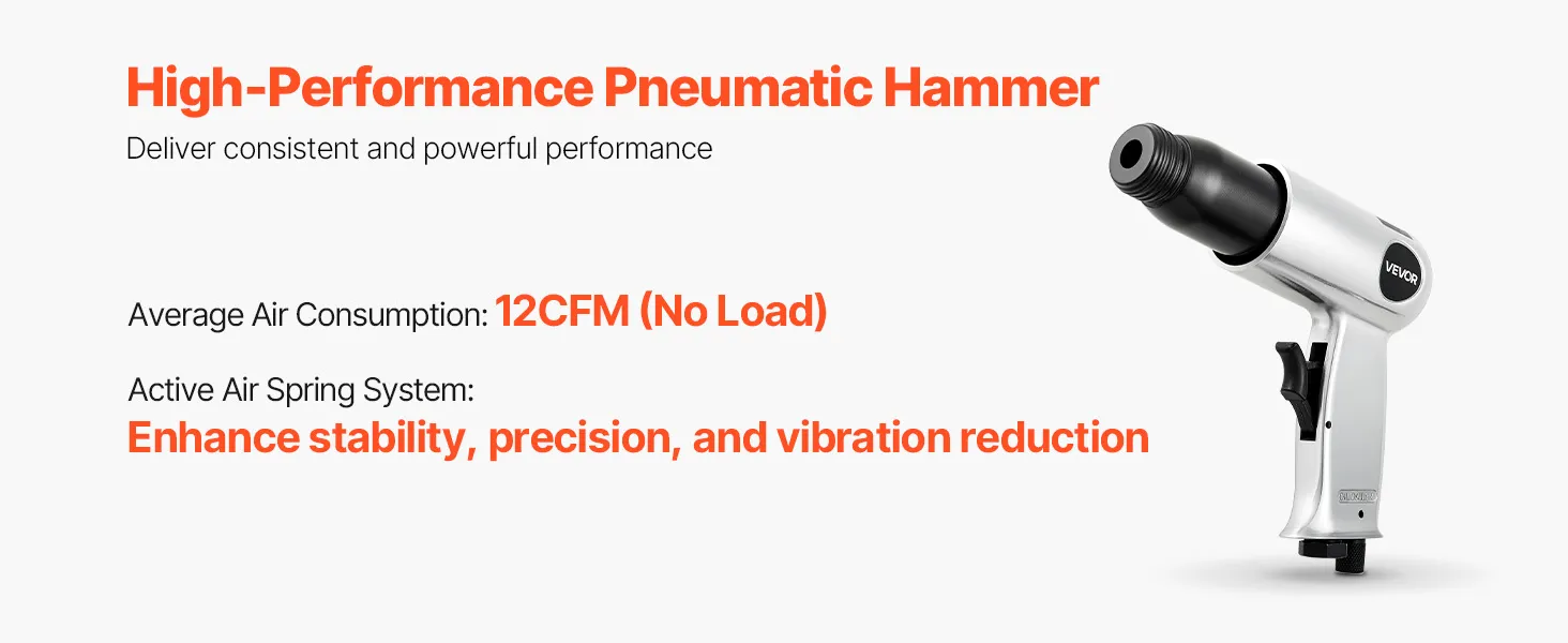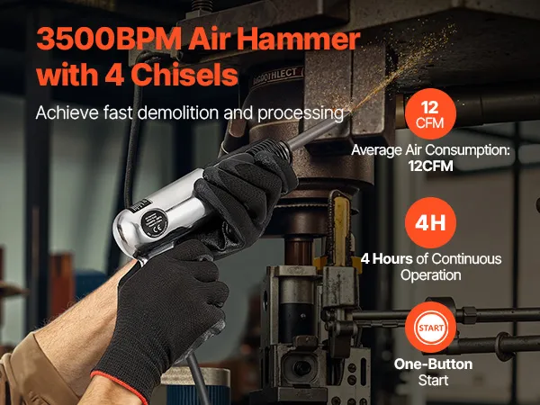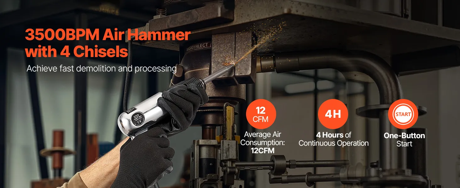 VEVOR air hammer delivers strong impact force with 3500 BPM high-frequency strikes and a 2.76-inch stroke, ideal for cutting metal, breaking concrete walls, chiseling floors, and removing bolts. It features 4 chisels, a one-button start function, an ergonomic grip, and a compact yet durable body.