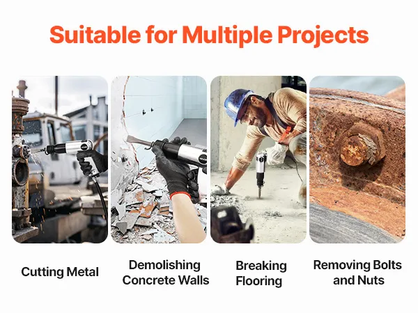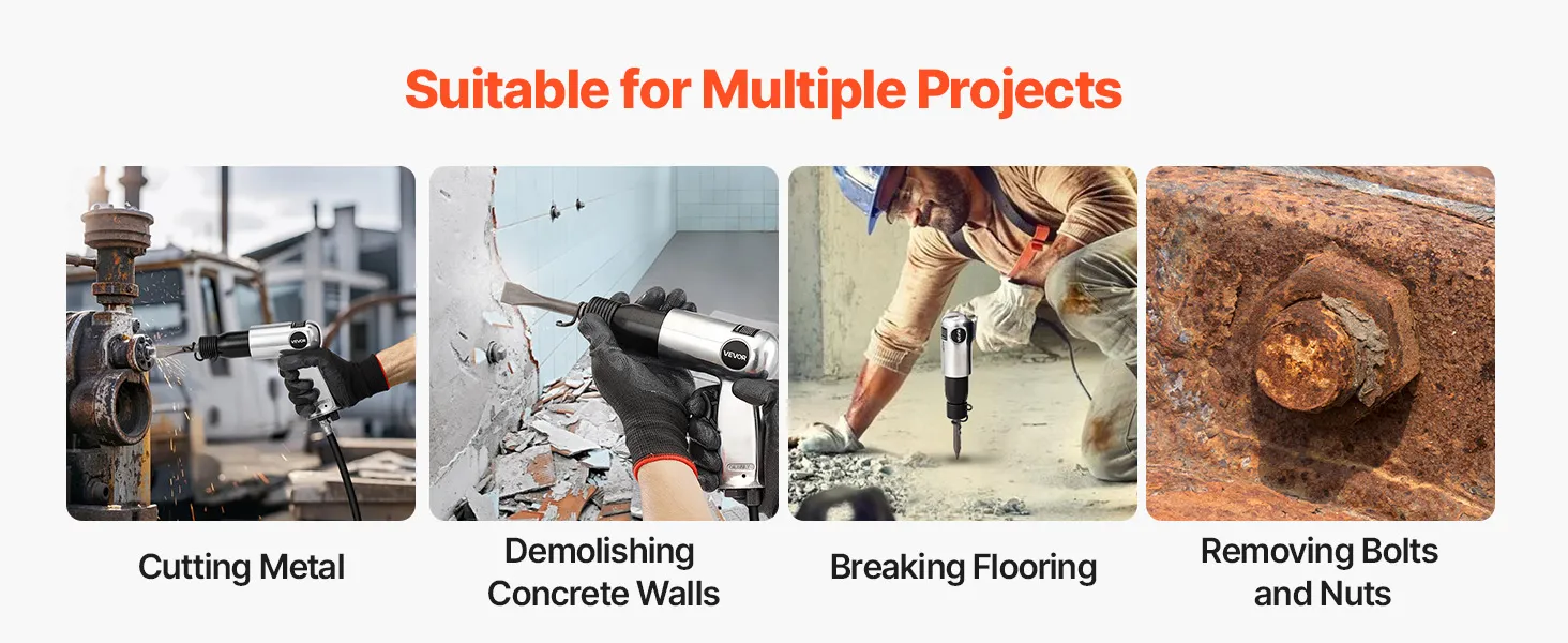 Multiple Applications: This air chisel pneumatic hammer is ideal for cutting metal, demolishing concrete walls, breaking flooring, and removing bolts and nuts. Compact, lightweight, yet powerful, it's your go-to tool for construction sites and repair workshops