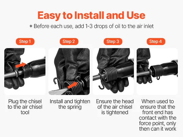 Easy to Use: Designed with a responsive trigger and one-button start function, this pneumatic hammer is simple to operate with no need to change triggers. And the ergonomic pistol-grip design ensures a comfortable, anti-slip, secure, and fatigue-free grip