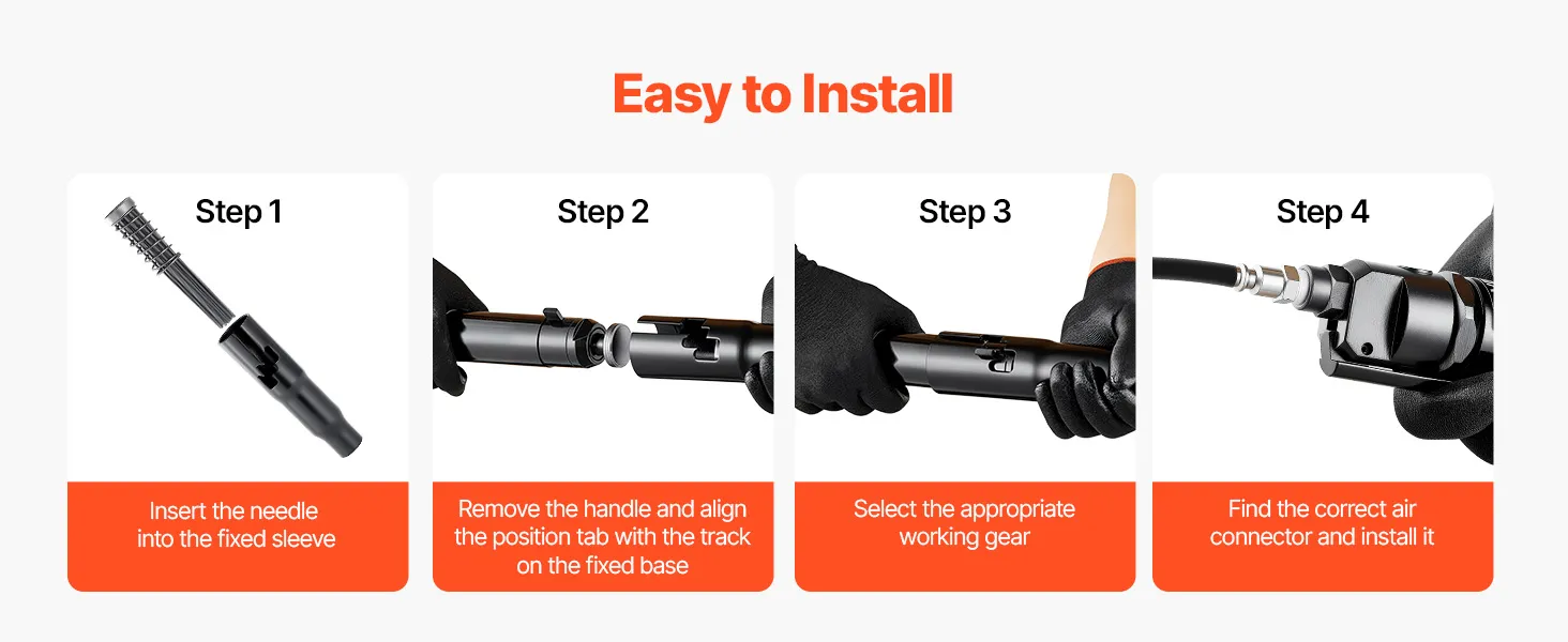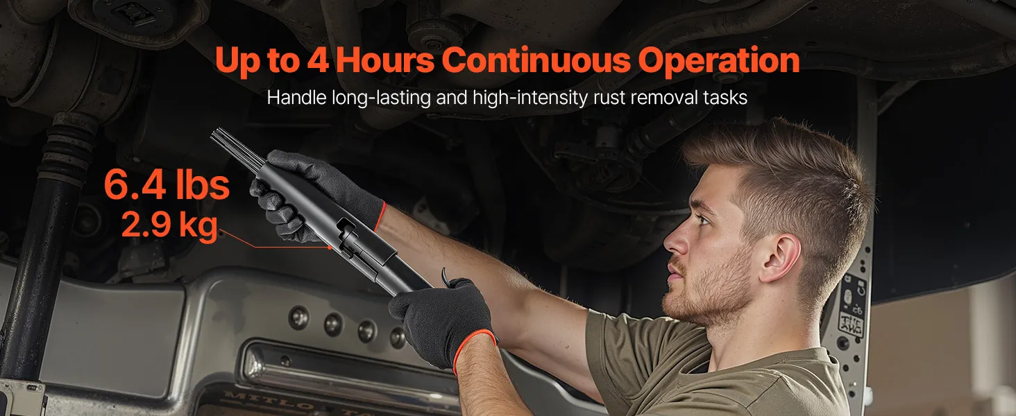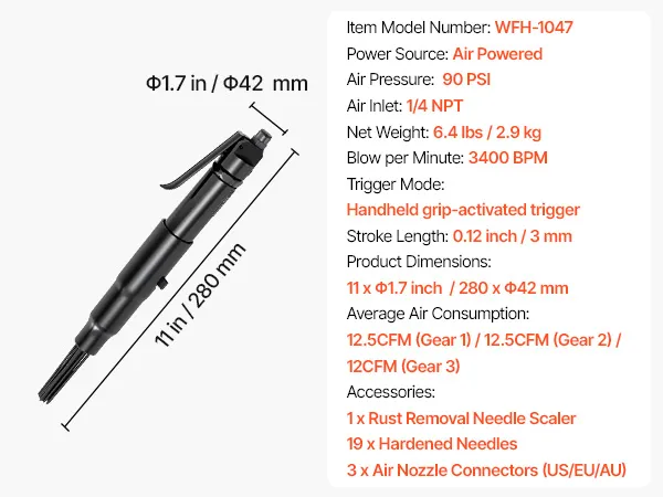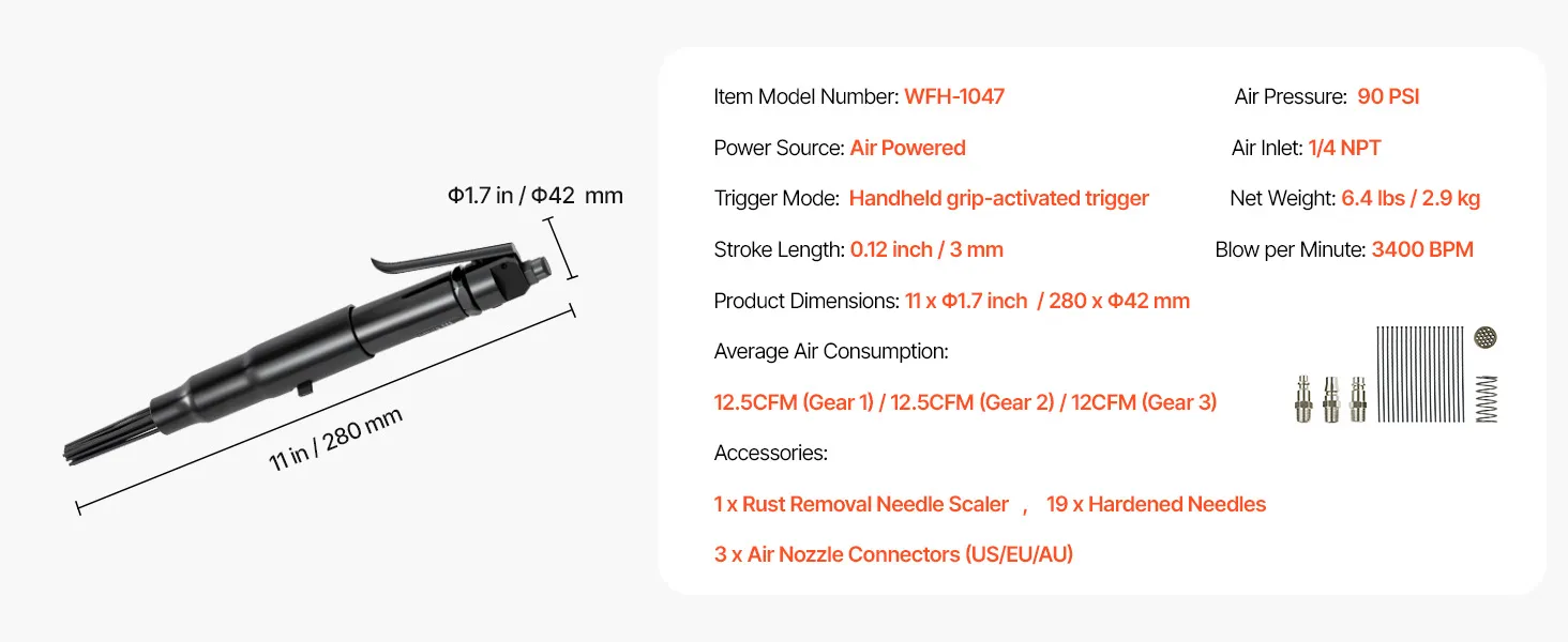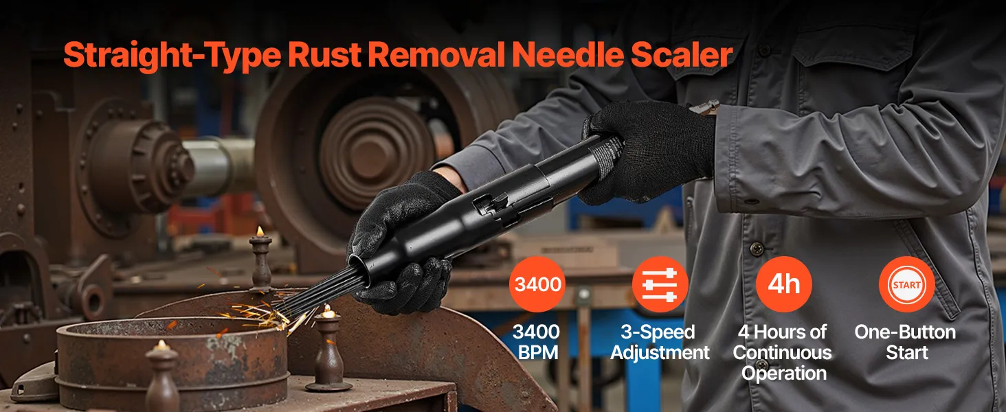 Powerful & Efficient: This air needle scaler delivers 3400 BPM high-frequency strikes for strong impact force, efficiently removing rust, paint, weld slag and dirt on metal surfaces. (Air Pressure: 90PSI ; Air Inlet: 1/4 NPT)