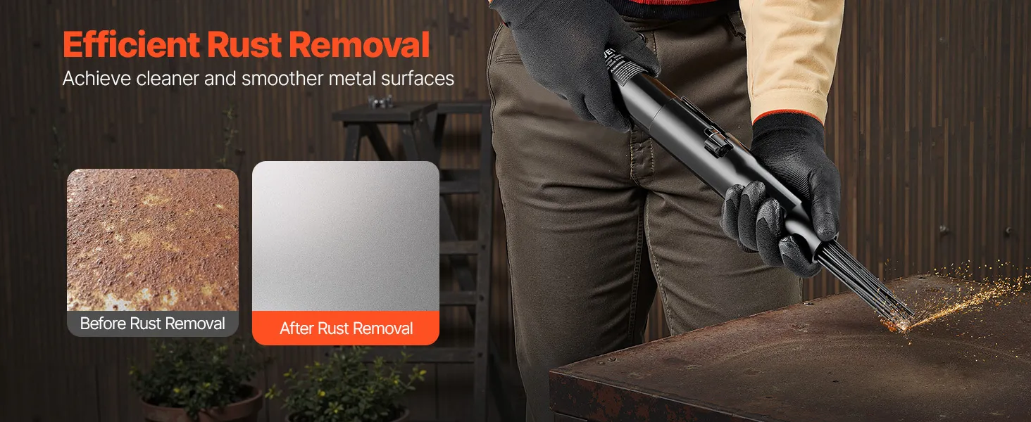 Multiple Applications: This air-powered needle scaler is ideal for removing rust, paint, and weld slag from metal surfaces, plates, pipes and more. Compact and lightweight yet powerful, it's a reliable tool for construction sites and repair workshops.