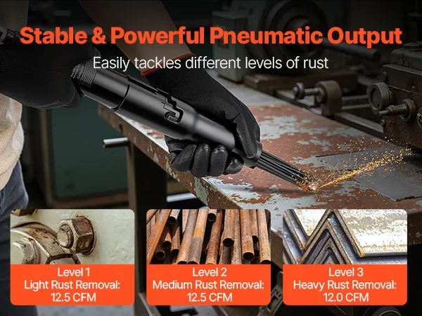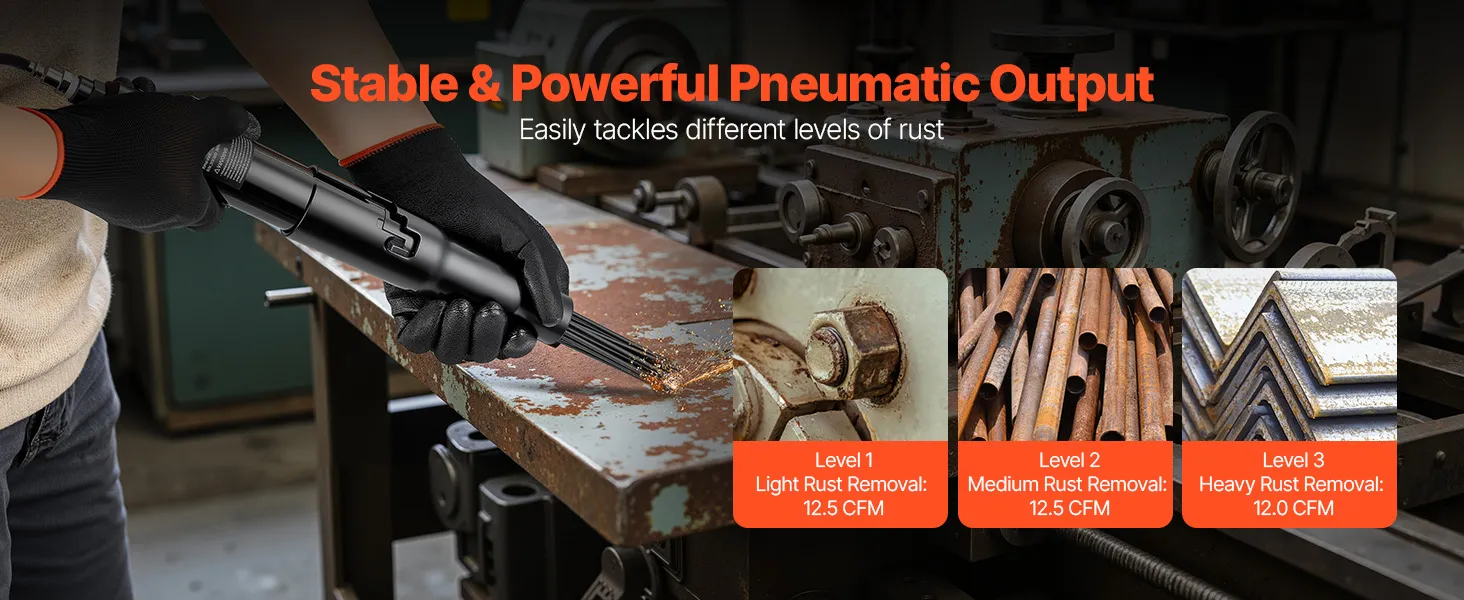 3-Speed Adjustment: Designed with 3-level average air consumption (Gear 1: 12.5 CFM, Gear 2: 12.5 CFM, Gear 3: 12 CFM), this VEVOR pneumatic needle scaler allows you easily adjust the intensity to suit your rust removal tasks—whether for light and heavy-duty rust
