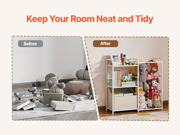 This bookshelf and stuffed animal storage holds clothes, backpacks, school supplies, and personal items. Spacious compartments and a flexible layout help keep any space, classrooms, bedrooms, or playrooms organized, making it easier for kids to tidy up independently.