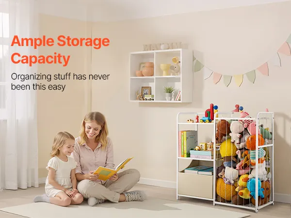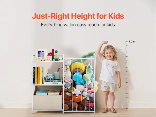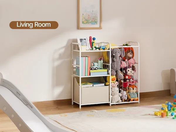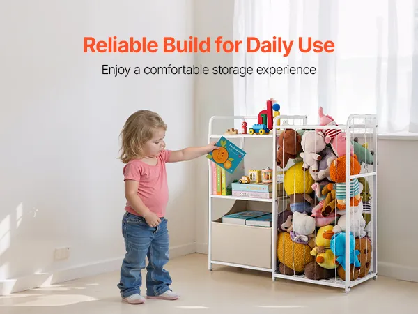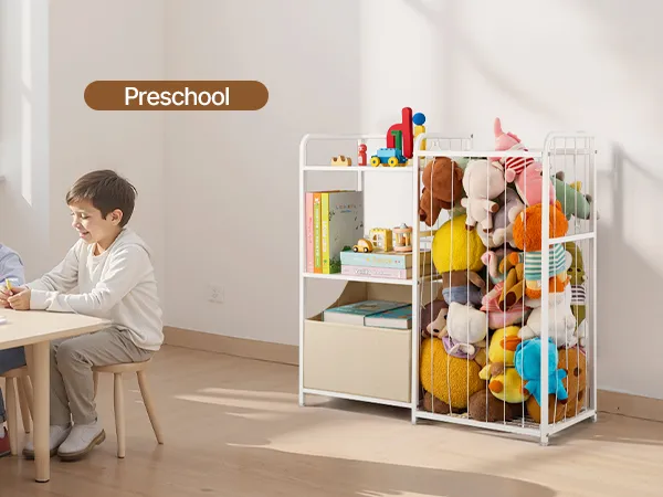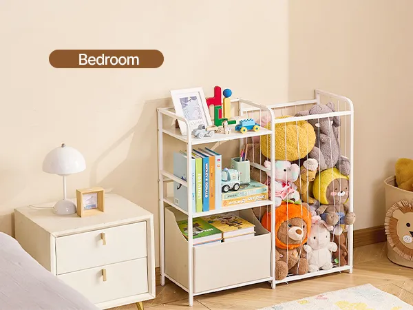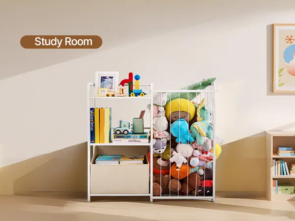 Streamlined Organization: This stuffed animal storage features 4 compartments, a bottom tray, a right-side metal basket, and a top shelf for plenty of space. It helps kids keep items in place, encouraging organizing habits from an early age