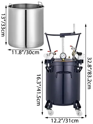 8-gallon pressure pot features an isolation net to isolate impurities; the stirring blade can stir the paint to avoid uneven coating precipitation.