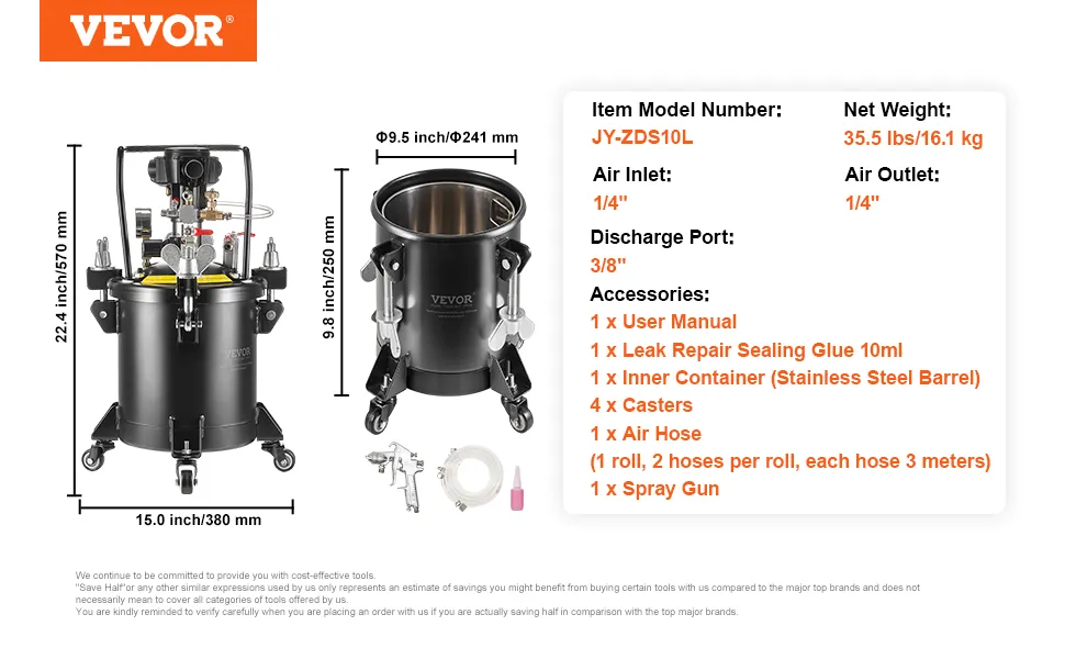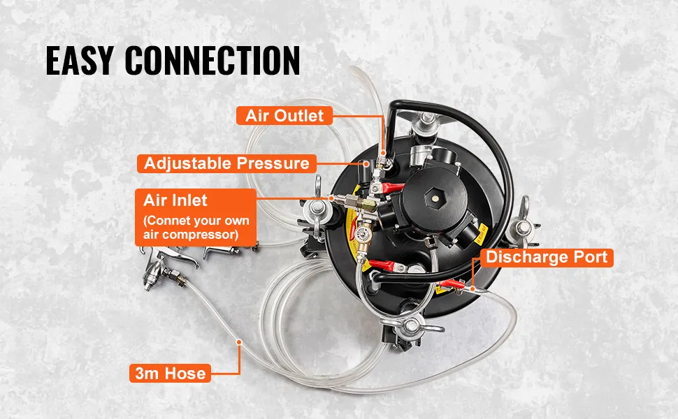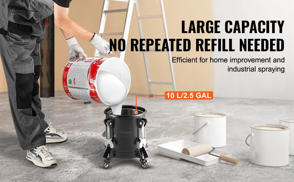 10L Large Capacity: The spray paint pressure pot tank has a 10L/2.5 gal capacity, with inlet and a outlet diameters of 1/4" and fluid outlet diameter of 3/8". This extra-large capacity allows you to efficiently complete painting tasks for building exteriors, outdoor fences, boats, home decor, and more, without the need for frequent paint refills.
