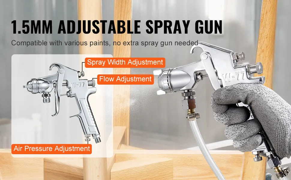 The spray gun is suitable for common paints such as latex, water-based sand, and metallic coatings. It features three adjustable knobs to control air pressure, paint flow, and spray pattern, ensuring an even fan-shaped atomization.